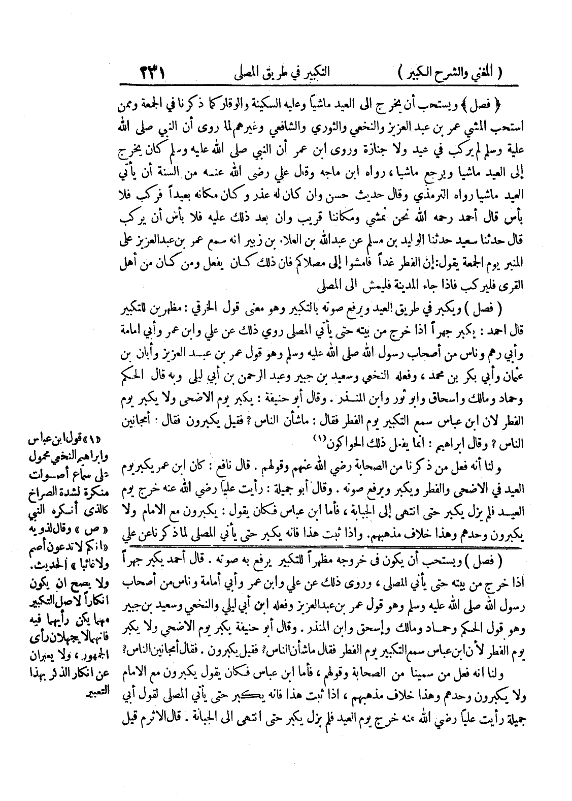 قال أحمد يكبر جهراً إذا خرج من بيته حتى يأتي المصلى، وروي ذلك عن علي وابن عمر وأبي أمامة وناس من أصحاب رسول الله صلى الله عليه وسلم وهو قول عمر بن عبد العزيز وفعله ابن أبي ليلى والنخعي وسعيد بن جبير وهو قول الحكم وحماد ومالك وإسحق وابن المنذر.
