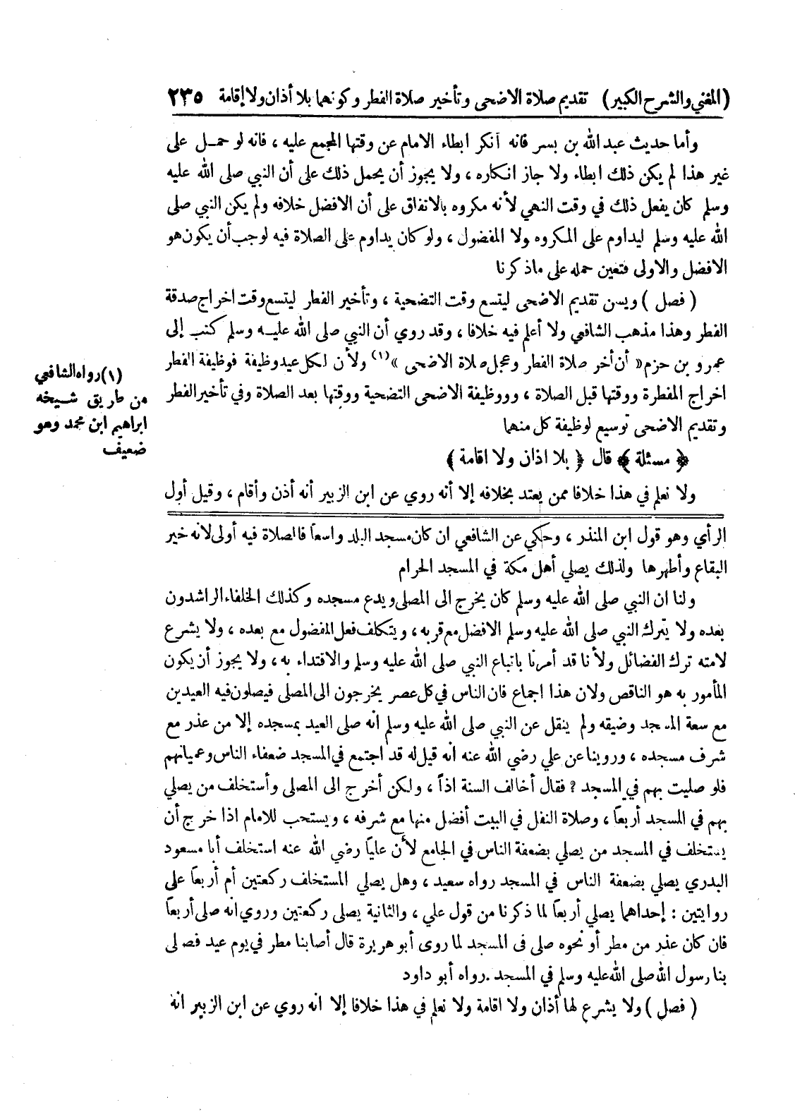 الرأي وهو قول ابن المنذر، وحكي عن الشافعي إن كان مسجد البلد واسعاً فالصلاة فيه أولى لأنه خير البقاع وأطهرها ولذلك يصلي أهل مكة في المسجد الحرام ولنا أن النبي صلى الله عليه وسلم كان يخرج الى المصلى ويدع مسجده وكذلك الخلفاء الراشدون بعده ولا يترك النبي صلى الله عليه وسلم الأفضل مع قربه، ويتكلف فعل المفضول مع بعده، ولا يشرع لأمته ترك الفضائل ولأنا قد أمرنا باتباع النبي صلى الله عليه وسلم والاقتداء به، ولا يجوز أن يكون المأمور به هو الناقص ولأن هذا إجماع فان الناس في كل عصر يخرجون الى المصلى فيصلون فيه العيدين مع سعة المسجد وضيقه ولم ينقل عن النبي صلى الله عليه وسلم أنه صلى العيد بمسجده إلا من عذر مع شرف مسجده، وروينا عن علي رضي الله عنه أنه قيل له قد اجتمع في المسجد ضعفاء الناس وعميانهم فلو صليت بهم في المسجد؟ فقال أخالف السنة إذاً، ولكن أخرج الى المصلى واستخلف من يصلي بهم في المسجد أربعاً، وصلاة النفل في البيت أفضل منها مع شرفه، ويستحب للإمام إذا خرج أن يستخلف في المسجد من يصلي بضعفة الناس في الجامع لأن علياً رضي الله عنه استخلف أبا مسعود البدري يصلي بضعفة الناس في المسجد رواه سعيد، وهل يصلي المستخلف ركعتين أم أربعا على روايتين: إحداهما يصلي أربعا لما ذكرنا من قول علي، والثانية يصلى ركعتين وروي انه صلى أربعاً فان كان عذر من مطر أو نحوه صلى في المسجد لما روى أبو هريرة قال أصابنا مطر في يوم عيد فصلى بنا رسول الله صلى الله عليه وسلم في المسجد.