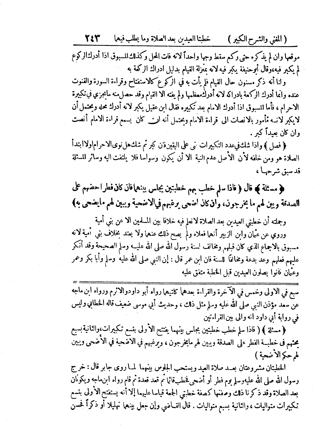 في رواية أبي داود أنه والى بين القراءتين * (مسألة) * (فإذا سلم خطب خطبتين يجلس بينهما يفتتح الأولى بتسع تكبيرات، والثانية بسبع يحثهم في خطبة الفطر على الصدقة ويبين لهم ما يخرجون، ويرغبهم في الاضحية في الأضحى ويبين لهم حكم الأضحية) الخطبتان مشروعتان بعد صلاة العيد ويستحب الجلوس بينهما لما روى جابر قال: خرج رسول الله صلى الله عليه وسلم يوم فطر أو أضحى فخطب قائماً ثم قعد قعدة ثم قام رواه ابن ماجه ويكونان بعد الصلاة وقد ذكرنا ذلك وصفتها كصفة خطبتي الجمعة قياساً عليهما إلا أنه يستفتح الأولى بتسع تكبيرات متواليات، والثانية بسبع متواليات.