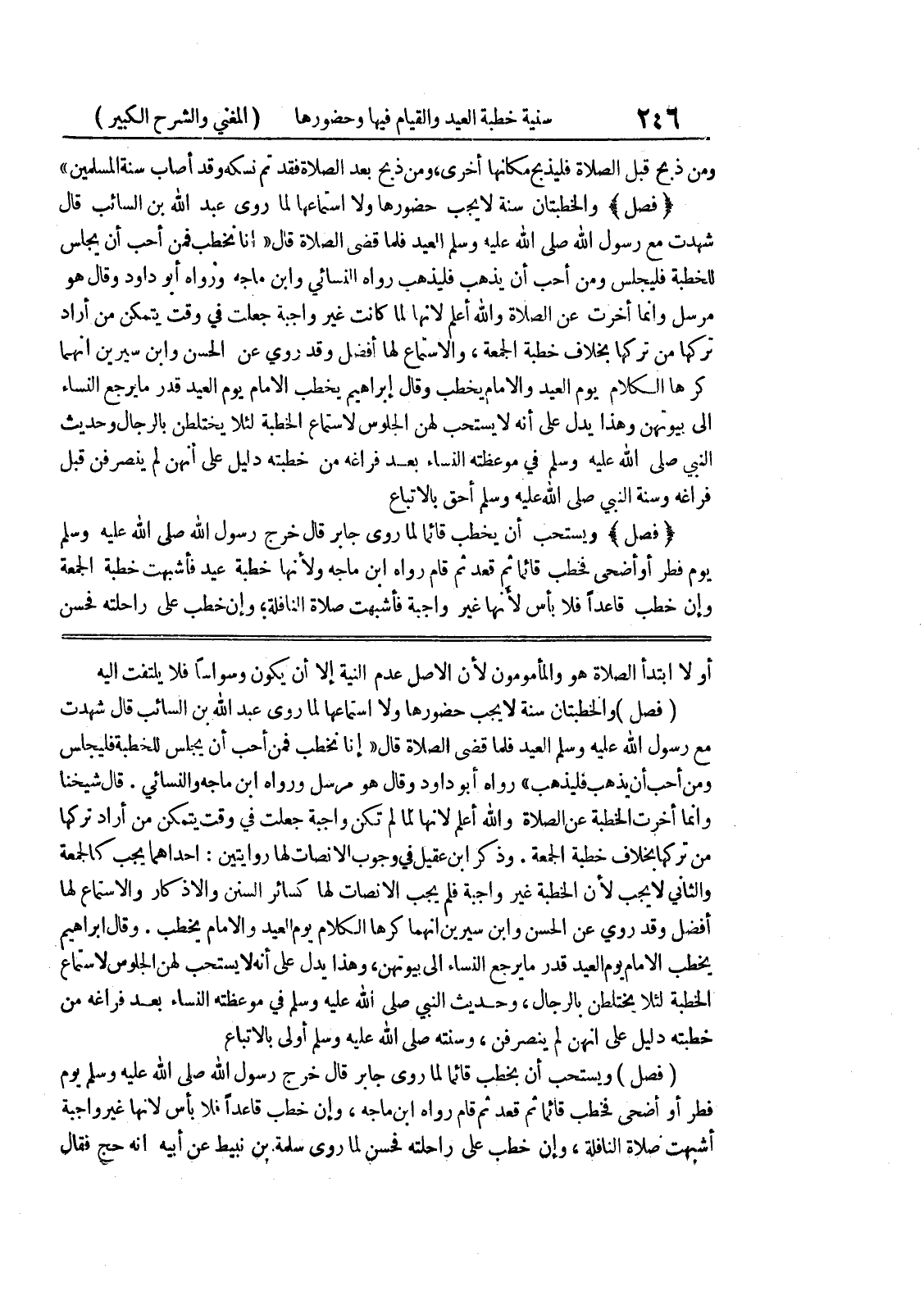 أو لا ابتدأ الصلاة هو والمأمومون لأن الأصل عدم النية إلا أن يكون وسواسا فلا يلتفت إليه (فصل) والخطبتان سنة لا يجب حضورها ولا استماعها لما روى عبد الله بن السائب قال شهدت