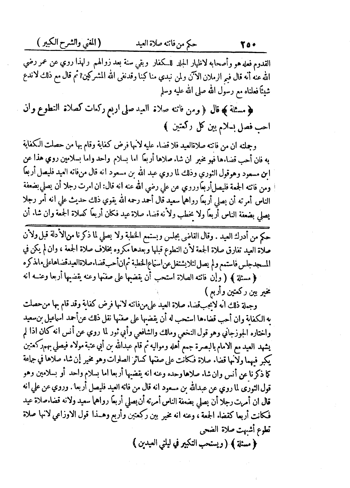 وقال القاضي يجلس ويستمع الخطبة ولا يصلي لما ذكرنا من الأدلة قبل ولأن صلاة العيد تفارق صلاة الجمعة لأن التطوع قبلها وبعدها مكروه بخلاف صلاة الجمعة، وإن لم يكن في المسجد جلس فاستمع ولم يصل لئلا يشتغل عن استماع الخطبة ثم ان أحب قضاء صلاة العيد قضاها على ما نذكره * (مسألة) * (وإن فاتته الصلاة استحب أن يقضيها على صفتها وعنه يقضيها أربعاً وعنه أنه مخير بين ركعتين وأربع) وجملة ذلك أنه لا يجب قضاء صلاة العيد على من فاتته لأنها فرض كفاية وقد قام بها من حصلت به الكفاية وان أحب قضاءها استحب له أن يقضيها على صفتها نقل ذلك عن أحمد اسماعيل بن سعيد واختاره الجوزجاني وهو قول النخعي ومالك والشافعي وأبي ثور لما روي عن أنس أنه كان إذا لم يشهد العيد مع الامام بالبصرة جمع أهله ومواليه ثم قام عبد الله بن أبي عتبة مولاه فيصلي بهم ركعتين يكبر فيهما ولأنها قضاء صلاة فكانت على صفتها كسائر الصلوات وهو مخير إن شاء صلاها في جماعة كما ذكرنا عن أنس وان شاء صلاها وحده وعنه أنه يقضيها أربعا اما بسلام واحد أو بسلامين وهو قول الثوري لما روي عن عبد الله بن مسعود أنه قال من فاته العيد فليصل أربعا.