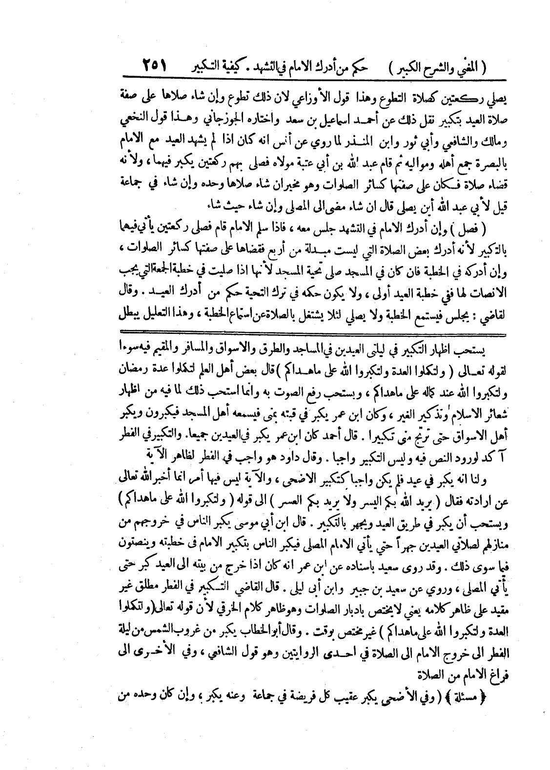 وقال أبو الخطاب يكبر من غروب الشمس من ليلة الفطر الى خروج الامام الى الصلاة في إحدى الروايتين وهو قول الشافعي، وفي الأخرى الى فراغ الامام من الصلاة * (مسألة) * (وفي الأضحى يكبر عقيب كل فريضة في جماعة وعنه يكبر، وإن كان وحده من