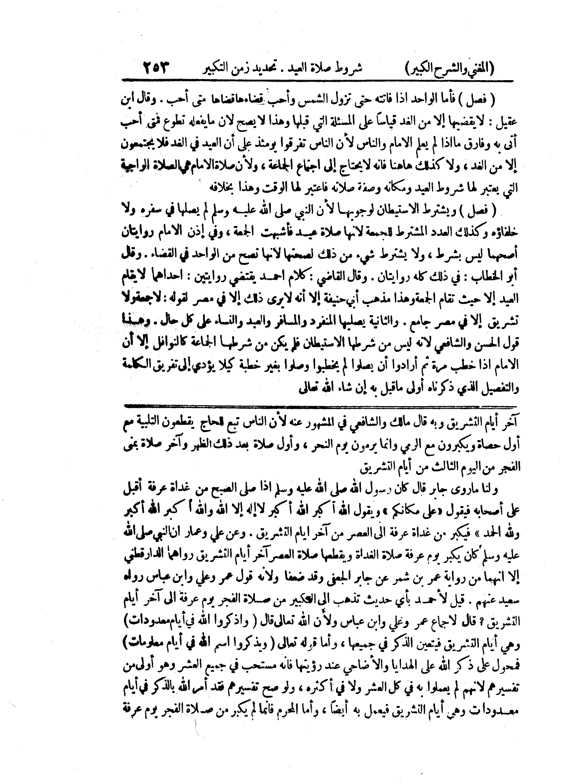 قيل لأحمد بأي حديث تذهب الى التكبير من صلاة الفجر يوم عرفة إلى آخر أيام التشريق؟ قال لإجماع عمر وعلي وابن عباس ولأن الله تعالى قال (واذكروا الله في أيام معدودات) وهي أيام التشريق فيتعين الذكر في جميعها، وأما قوله تعالى (ويذكروا اسم الله في أيام معلومات) فمحول على ذكر الله على الهدايا والأضاحي عند رؤيتها فانه مستحب في جميع العشر وهو أولى من تفسيرهم لأنهم لم يعملوا به في كل العشر ولا في أكثره، ولو صح تفسيرهم فقد أمر الله بالذكر في أيام معدودات وهي أيام التشريق فيعمل به أيضاً، وأما المحرم فإنما لم يكبر من صلاة الفجر يوم عرفة