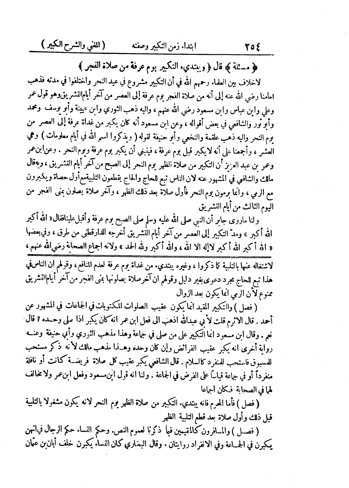 ولنا أنه قول ابن مسعود وفعل ابن عمر ولا مخالف لهما في الصحابة فكان إجماعاً (فصل) فأما المحرم فانه يبتدئ التكبير من صلاة الظهر يوم النحر لأنه يكون مشغولاً بالتلبية قبل ذلك وأول صلاة بعد قطع التلبية الظهر (فصل) والمسافرون كالمقيمين فيما ذكرنا لعموم النص.