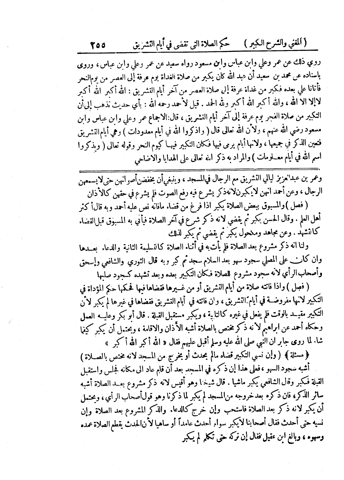 وعن مجاهد ومكحول يكبر ثم يقضي ثم يكبر لذلك ولنا أنه ذكر مشروع بعد الصلاة فلم يأت به في أثناء الصلاة كالتسليمة الثانية والدعاء بعدها وان كان على المصلي سجود سهو بعد السلام سجد ثم كبر وبه قال الثوري والشافعي وإسحق وأصحاب الرأي لأنه سجود مشروع للصلاة فكان التكبير بعده وبعد تشهده كسجود صلبها (فصل) واذا فاتته صلاة من أيام التشريق أو من غيرها فقضاها فيها فحكمها حكم المؤداة في التكبير لأنها مفروضة في أيام التشريق، وان فاتته في أيام التشريق فقضاها في غيرها لم يكبر لأن التكبير مقيد بالوقت فلم يفعل في غيره كالتلبية، ويكبر مستقبل القبلة.