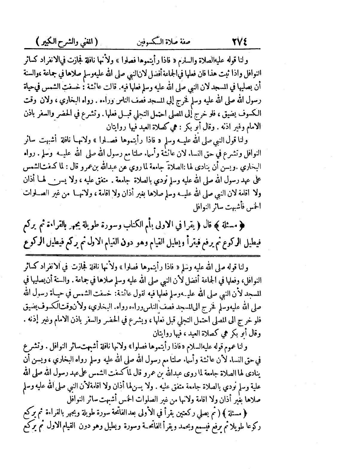 البخاري، ولأن وقت الكسوف يضيق فلو خرج الى المصلى احتمل التجلي قبل فعلها، ويشرع في الحضر والسفر بإذن الإمام وغير إذنه.