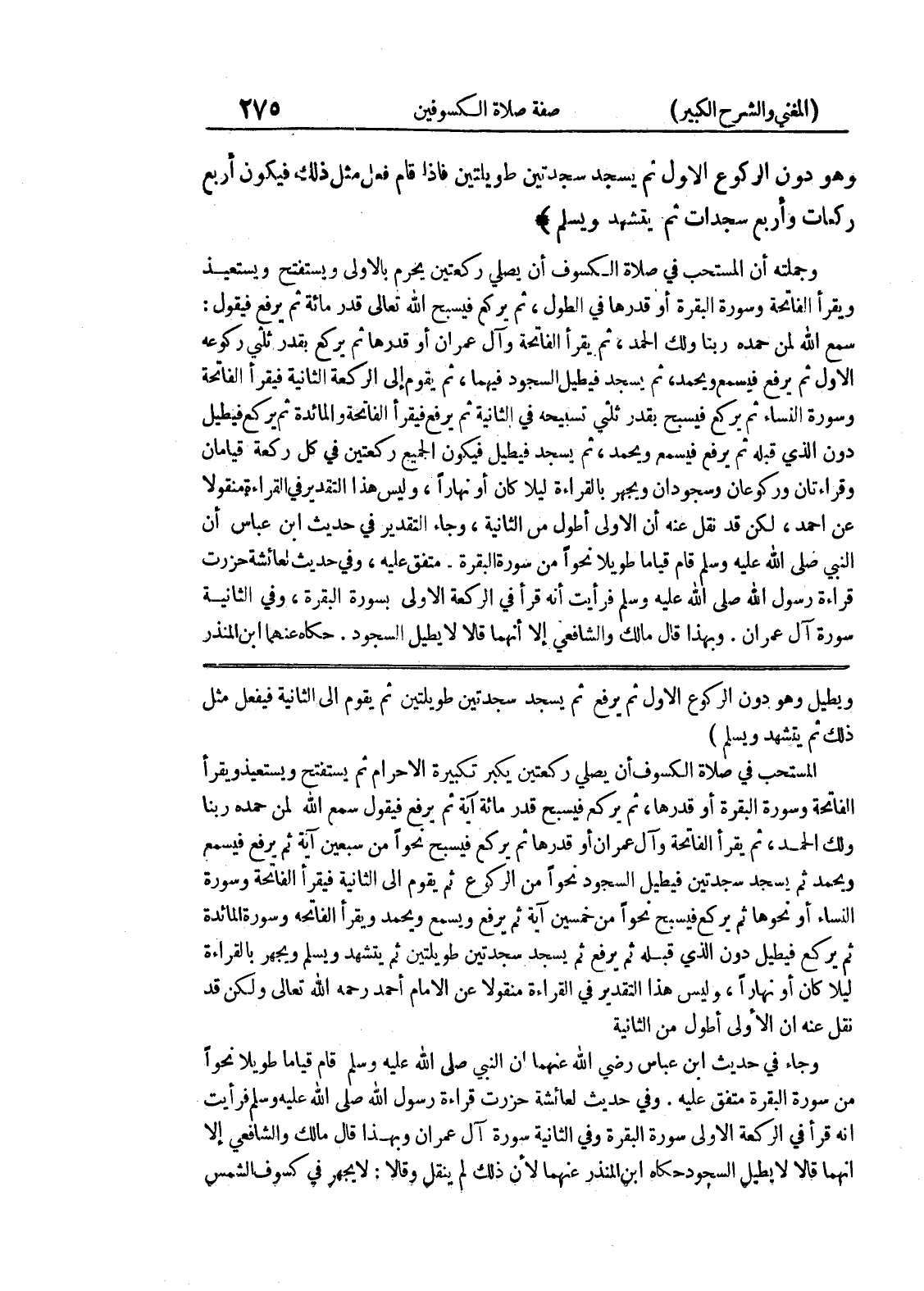 ذلك ثم يتشهد ويسلم) المستحب في صلاة الكسوف أن يصلي ركعتين يكبر تكبيرة الاحرام ثم يستفتح ويستعيذ ويقرأ الفاتحة وسورة البقرة أو قدرها، ثم يركع فيسبح قدر مائة آية ثم يرفع فيقول سمع الله لمن حمده ربنا ولك الحمد، ثم يقرأ الفاتحة وآل عمران أو قدرها ثم يركع فيسبح نحواً من سبعين آية ثم يرفع فيسمع ويحمد ثم يسجد سجدتين فيطيل السجود نحواً من الركوع ثم يقوم الى الثانية فيقرأ الفاتحة وسورة النساء أو نحوها ثم يركع فيسبح نحواً من خمسين آية ثم يرفع ويسمع ويحمد ويقرأ الفاتحة وسورة المائدة ثم يركع فيطيل دون الذي قبله ثم يرفع ثم يسجد سجدتين طويلتين ثم يتشهد ويسلم ويجهر بالقراءة ليلاً كان أو نهاراً، وليس هذا التقدير في القراءة منقولاً عن الإمام أحمد رحمه الله تعالى ولكن قد نقل عنه أن الأولى أطول من الثانية وجاء في حديث ابن عباس رضي الله عنهما أن النبي صلى الله عليه وسلم قام قياماً طويلاً نحواً من سورة البقرة متفق عليه.