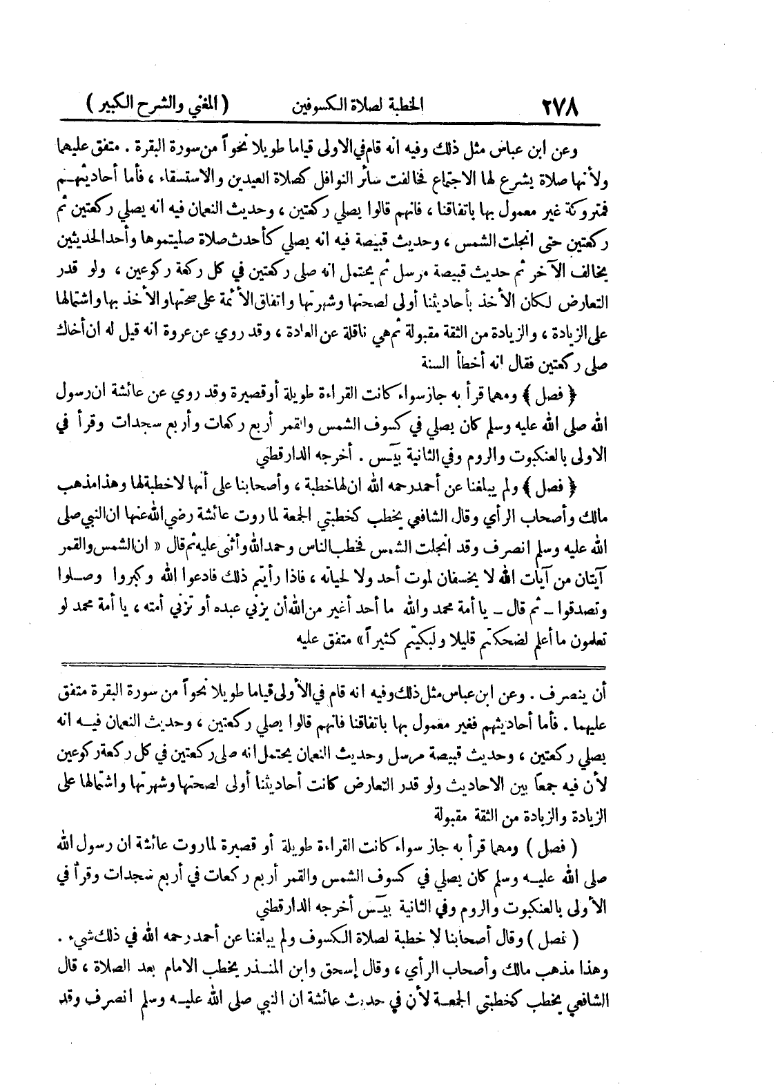 يصلي ركعتين، وحديث قبيصة مرسل وحديث النعمان يحتمل أنه صلى ركعتين في كل ركعة ركوعين لأن فيه جمعاً بين الأحاديث ولو قدر التعارض كانت أحاديثنا أولى لصحتها وشهرتها واشتمالها على الزيادة والزيادة من الثقة مقبولة (فصل) ومهما قرأ به جاز سواء كانت القراءة طويلة أو قصيرة لما روت عائشة أن رسول الله صلى الله عليه وسلم كان يصلي في كسوف الشمس والقمر أربع ركعات في أربع سجدات وقرأ في الأولى بالعنكبوت والروم وفي الثانية بيس أخرجه الدارقطني (فصل) وقال أصحابنا لا خطبة لصلاة الكسوف ولم يبلغنا عن أحمد رحمه الله في ذلك شئ.