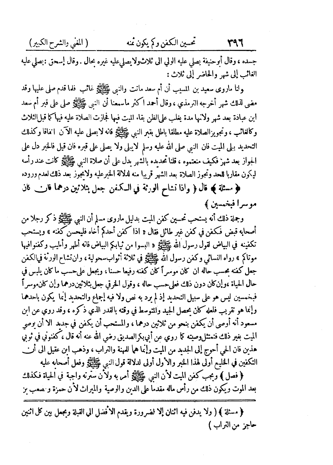 * (مسألة) * (ولا يدفن فيه إثنان إلا لضرورة ويقدم الأفضل إلى القبلة ويجعل بين كل إثنين حاجز من التراب)