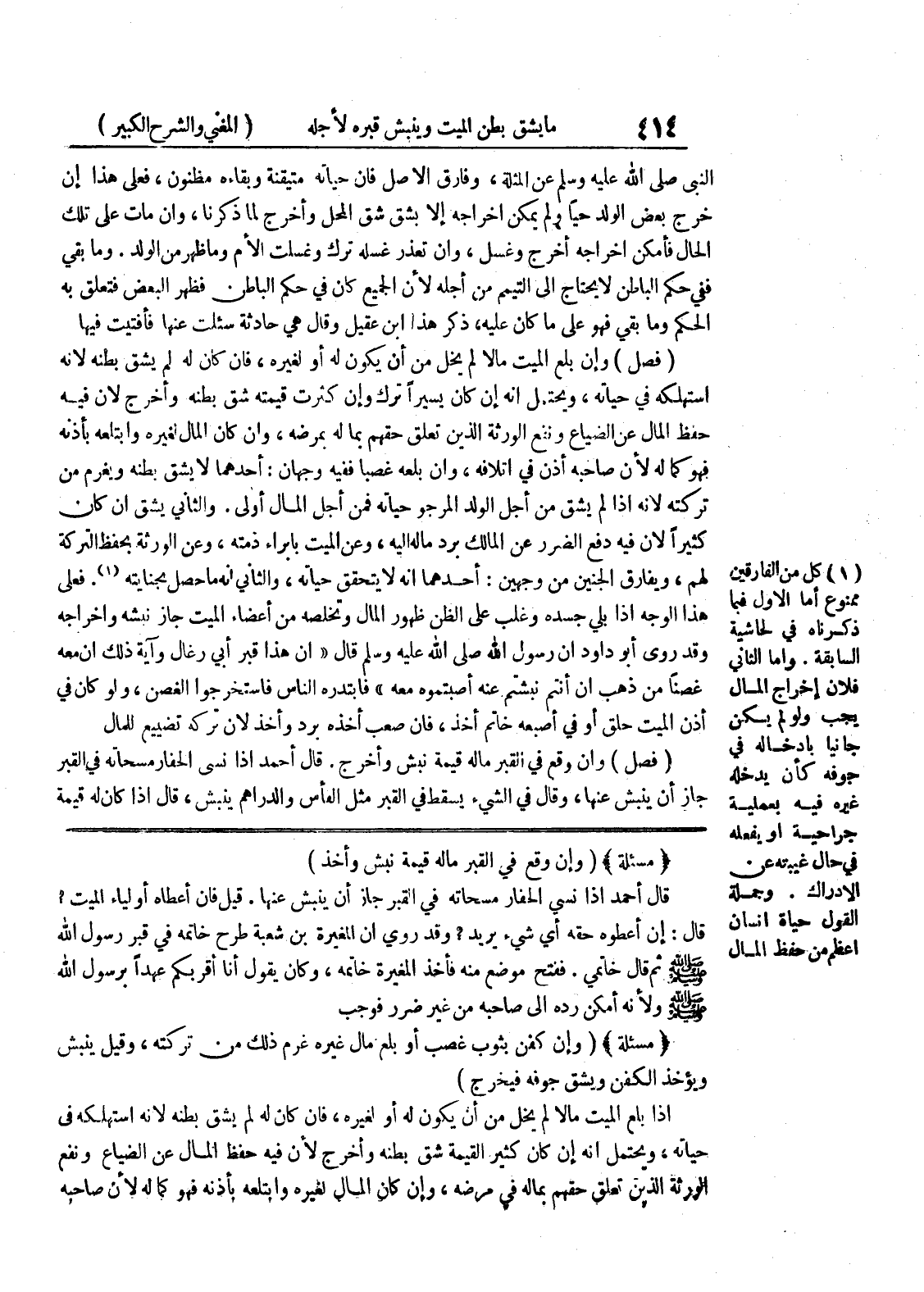 ففتح موضع منه فأخذ المغيرة خاتمه، وكان يقول أنا أقربكم عهداً برسول الله صلى الله عليه وسلم ولأنه أمكن رده إلى صاحبه من غير ضرر فوجب * (مسألة) * (وإن كفن بثوب غصب أو بلع مال غيره غرم ذلك من تركته، وقيل ينبش ويؤخذ الكفن ويشق جوفه فيخرج) إذا بلع الميت ما لا يخل من أن يكون له أو لغيره، فإن كان له لم يشق بطنه لأنه استهلكه في حياته، ويحتمل أنه إن كان كثير القبمة شق بطنه وأخرج لأن فيه حفظ المال عن الضياع ونفع الورثة الذين تعلق حقهم بماله في مرضه، وإن كان المال لغيره وابتلعه باذنه فهو كماله لأن صاحبه