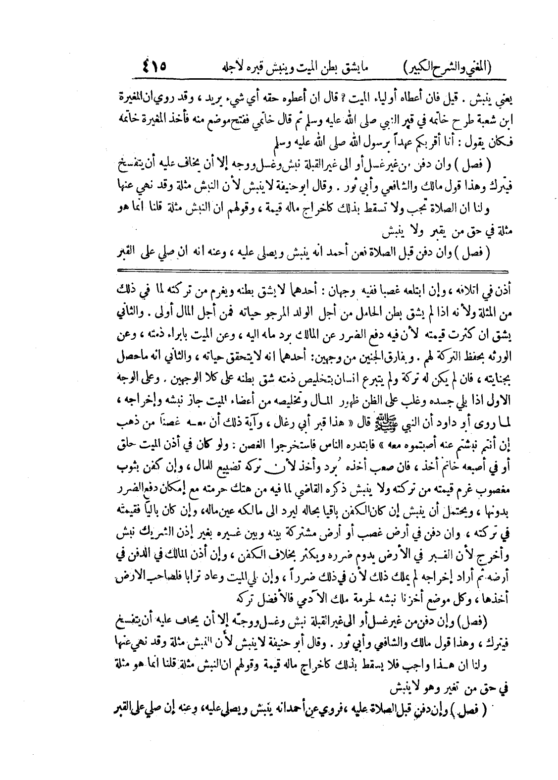 وعلى الوجه الأول اذا بلي جسده وغلب على الظن ظهور المال وتخليصه من أعضاء الميت جاز نبشه وإخراجه، لما روى أبو داود أن النبي صلى الله عليه وسلم قال " هذا قبر أبي رغال، وآية ذلك أن معه غصناً من ذهب إن أنتم نبشتم عنه أصبتموه معه " فابتدره الناس فاستخرجوا الغصن: ولو كان في أذن الميت حلق أو في اصبعه خاتم أخذ، فان صعب أخذه برد وأخذ لأن تركه تضييع للمال، وإن كفن بثوب مغصوب غرم قيمته من تركته ولا ينبش ذكره القاضي لما فيه من هتك حرمته مع إمكان دفع الضرر بدونها، ويحتمل أن ينبش إن كان الكفن باقيا بحاله ليرد الى مالكه عين ماله، وإن كان بالياً فقيمته في تركته، وان دفن في أرض غصب أو أرض مشتركة بينه وبين غيره بغير إذن الشريك نبش وأخرج لأن القبر في الأرض يدوم ضرره ويكثر بخلاف الكفن، وإن أذن المالك في الدفن في أرضه ثم أراد إخراجه لم يملك ذلك لأن في ذلك ضرراً، وإن بلي الميت وعاد تراباً فلصاحب الأرض أخذها، وكل موضع أخزنا نبشه لحرمة ملك الآدمي فالأفضل تركه (فصل) وإن دفن من غير غسل أو الى غير القبلة نبش وغسل ووجه إلا أن يخاف عليه أن يتفسخ فيترك، وهذا قول مالك والشافعي وأبي ثور.