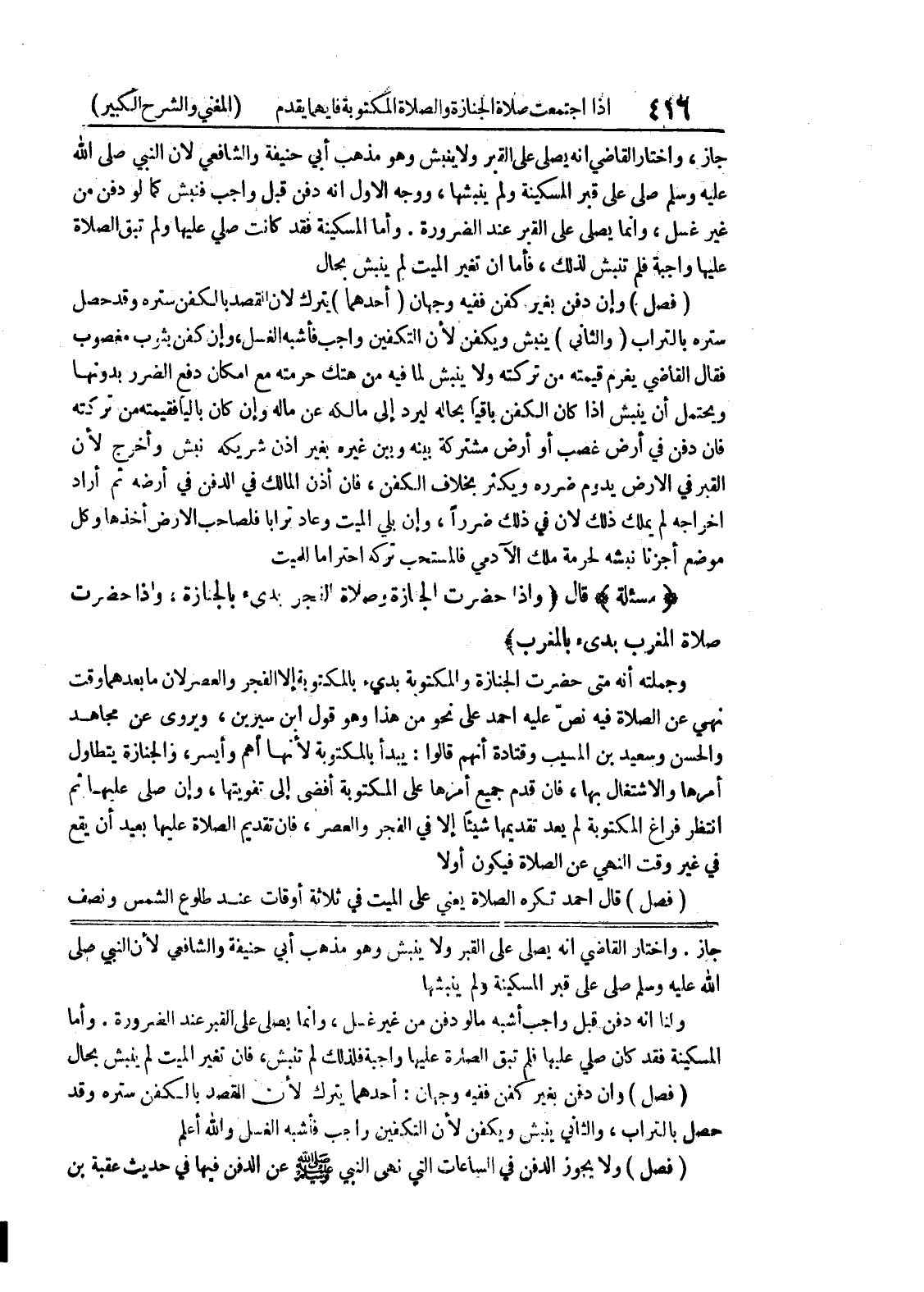 واختار القاضي أنه يصلى على القبر ولا ينبش وهو مذهب أبي حنيفة والشافعي لأن النبي صلى الله عليه وسلم صلى على قبر المسكينة ولم ينبشها ولنا انه دفن قبل واجب أشبه ما لو دفن من غير غسل، وانما يصلى على القبر عند الضرورة.