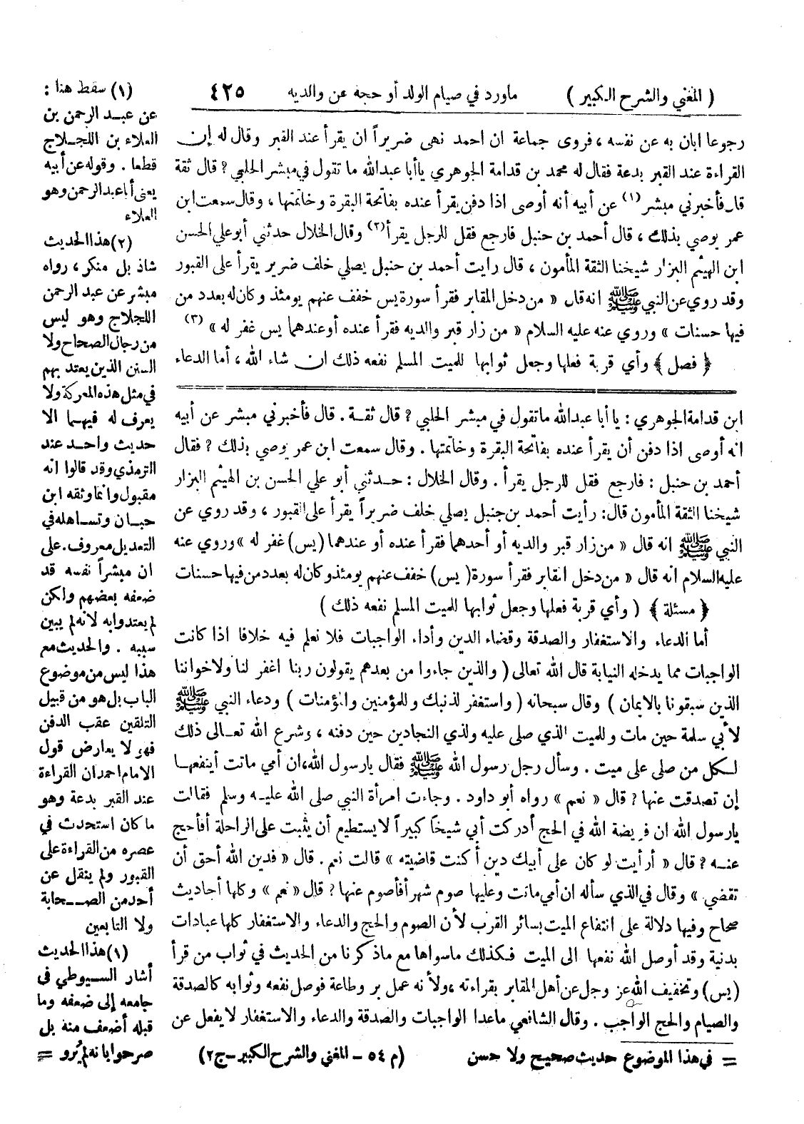 وقال الخلال: حدثني أبو علي الحسن بن الهيثم البزار شيخنا الثقة المأمون قال: رأيت أحمد بن جنبل يصلي خلف ضريراً يقرأ على القبور، وقد روي عن النبي صلى الله عليه وسلم أنه قال " من زار قبر والديه أو أحدهما فقرأ عنده أو عندهما (يس) غفر له " وروي عنه عليه السلام أنه قال " من دخل المقابر فقرأ سورة (يس) خفف عنهم يومئذ وكان له بعدد من فيها حسنات * (مسألة) * (وأي قربة فعلها وجعل ثوابها للميت المسلم نفعه ذلك) أما الدعاء والاستغفار والصدقة وقضاء الدين وأداء الواجبات فلا نعلم فيه خلافاً اذا كانت الواجبات مما يدخله النيابة قال الله تعالى (والذين جاءوا من بعدهم يقولون ربنا اغفر لنا ولإخواننا الذين سبقونا بالإيمان) وقال سبحانه (واستغفر لذنبك وللمؤمنين والمؤمنات) ودعاء النبي صلى الله عليه وسلم لأبي سلمة حين مات وللميت الذي صلي عليه ولذي النجادين حين دفنه، وشرع الله تعالى ذلك لكل من صلى علي ميت.