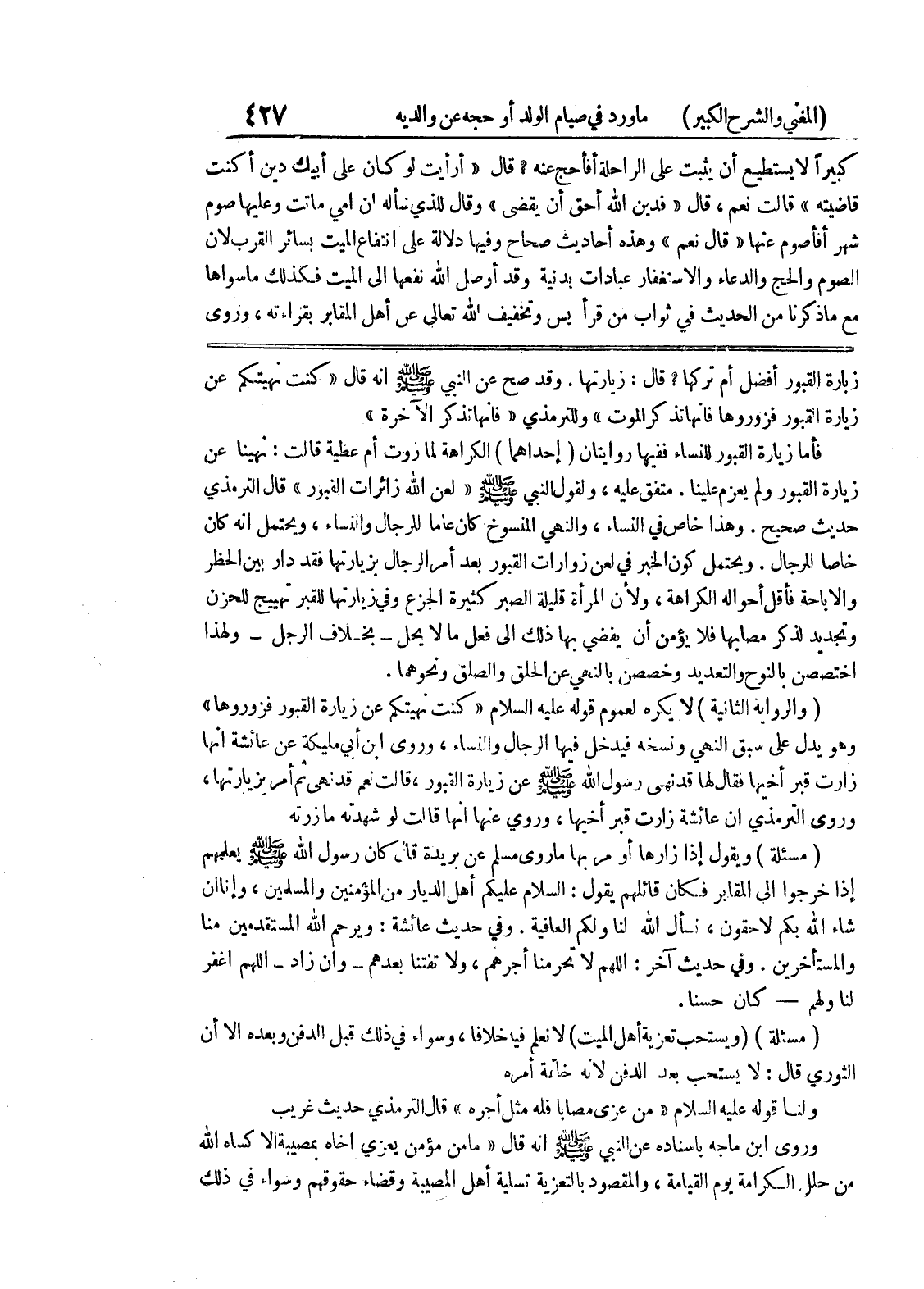 (والرواية الثانية) لا يكره لعموم قوله عليه السلام " كنت نهيتكم عن زيارة القبور فزوروها " وهو يدل على سبق النهي ونسخه فيدخل فيها الرجال والنساء، وروى ابن أبي مليكة عن عائشة أنها زارت قبر أخيها فقال لها قد نهى رسول الله صلى الله عليه وسلم عن زيارة القبور، قالت نعم قد نهى ثم أمر بزيارتها، وروى الترمذي ان عائشة زارت قبر أخيها، وروي عنها أنها قالت لو شهدته ما زرته