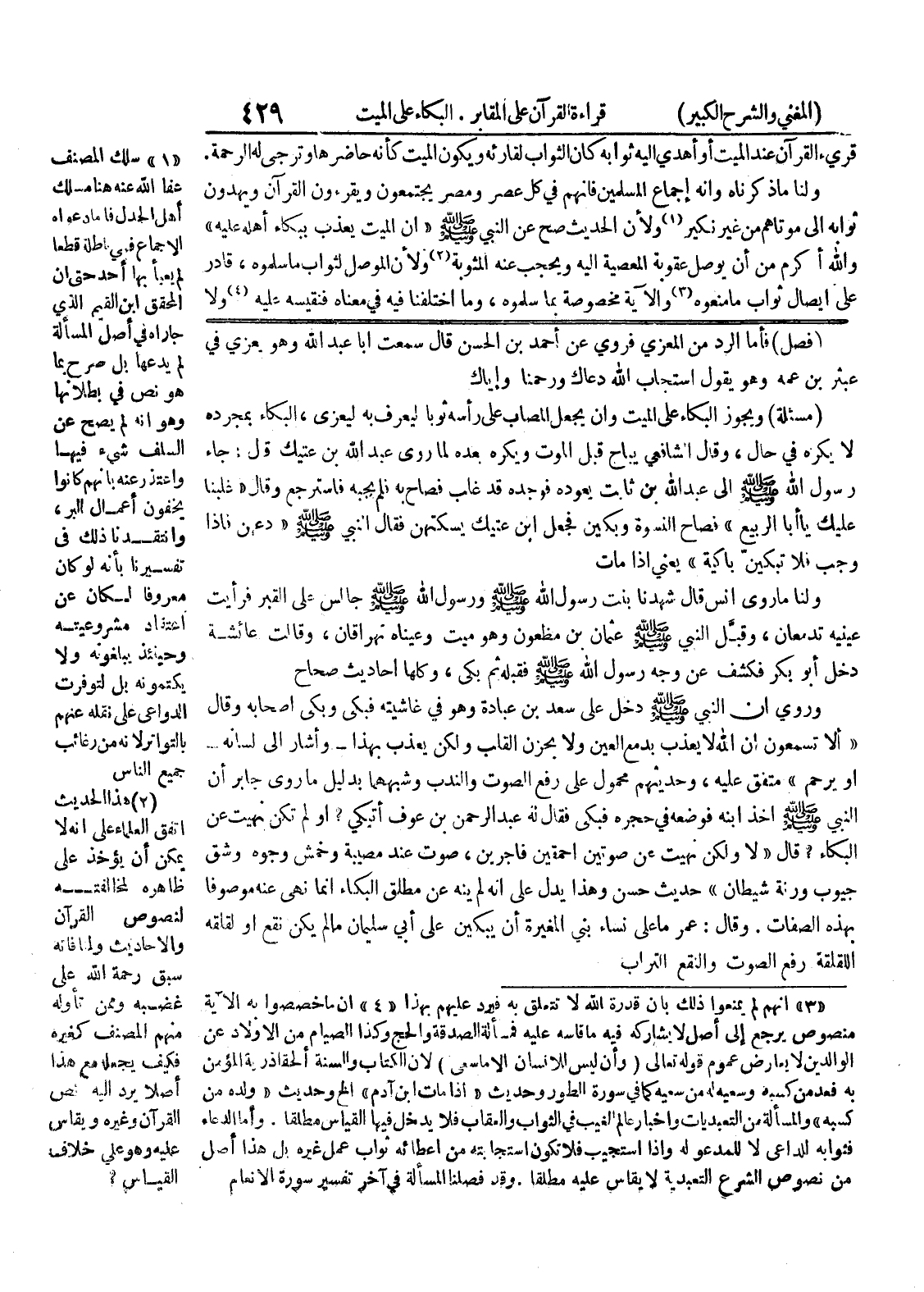 وروي أن النبي صلى الله عليه وسلم دخل على سعد بن عبادة وهو في غاشيته فبكى وبكى أصحابه وقال " ألا تسمعون أن الله لا يعذب بدمع العين ولا يحزن القلب ولكن يعذب بهذا - وأشار إلى لسانه - أو يرحم " متفق عليه، وحديثهم محمول على رفع الصوت والندب وشبهها بدليل ما روى جابر أن النبي أخذ ابنه فوضعه في حجره فبكى فقال له عبد الرحمن بن عوف أتبكي؟ أو لم تكن نهيت عن البكاء؟ قال " لا ولكن نهيت عن صوتين أحمقين فاجرين، صوت عند مصيبة وخمش وجوه وشق جيوب ورنة شيطان " حديث حسن وهذا يدل على أنه لم ينه عن مطلق البكاء انما نهى عنه موصوفا بهذه الصفات.