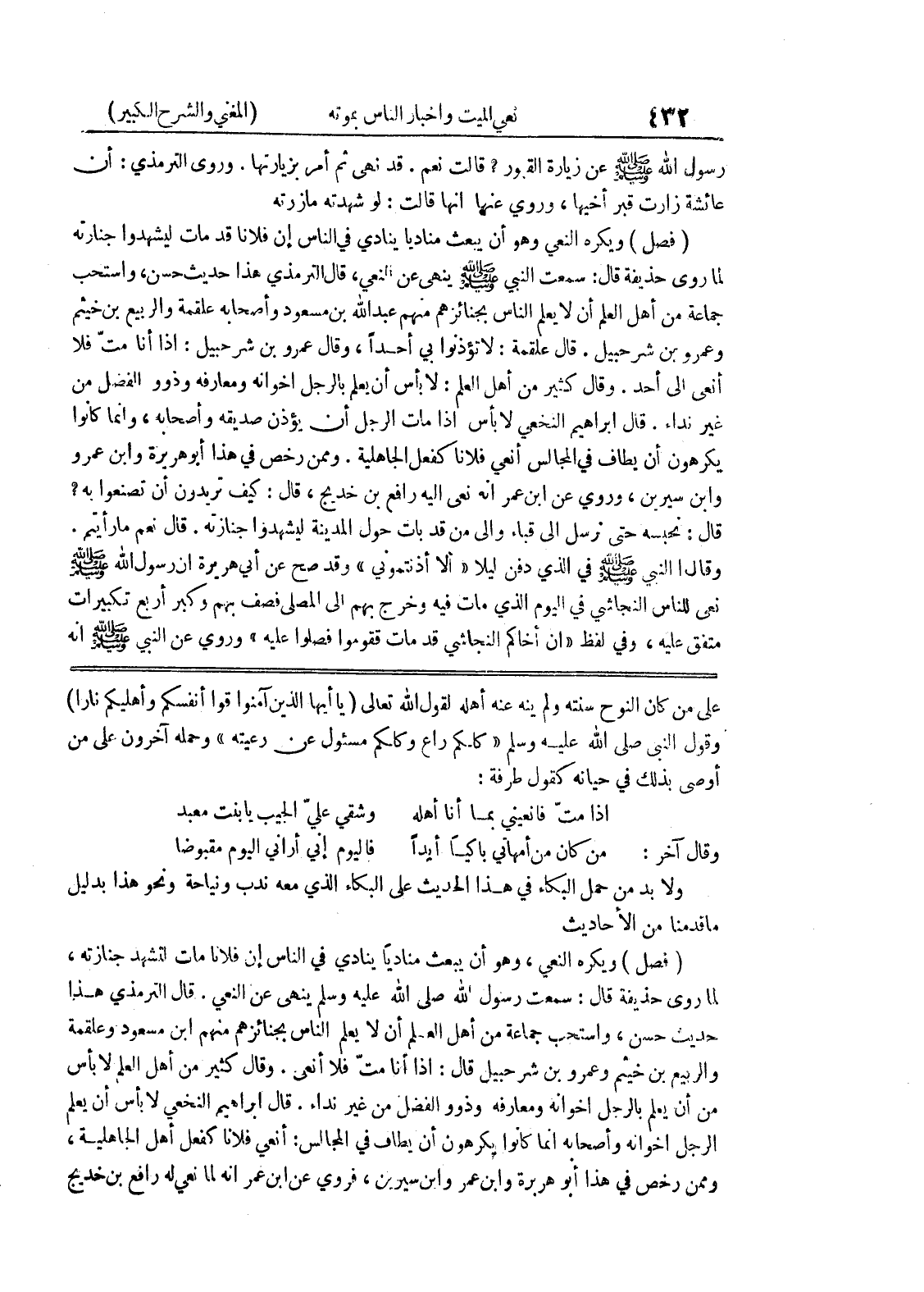 على من كان النوح سنته ولم ينه عنه أهله لقول الله تعالى (يا أيها الذين آمنوا قوا أنفسكم وأهليكم نارا) وقول النبي صلى الله عليه وسلم " كلكم راع وكلكم مسئول عن رعيته " وحمله آخرون على من أوصى بذلك في حياته كقول طرفة: إذا مت فانعيني بما أنا أهله * وشقي علي الجيب يا بنت معبد وقال آخر: من كان من أمهاتي باكيا أيدا * فاليوم إني أراني اليوم مقبوضا ولا بد من حمل البكاء في هذا الحديث على البكاء الذي معه ندب ونياحه ونحو هذا بدليل ما قدمنا من الأحاديث (فصل) ويكره النعي، وهو أن يبعث منادياً ينادي في الناس أن فلاناً مات لتشهد جنازته، لما روى حذيفة قال: سمعت رسول الله صلى الله عليه وسلم ينهى عن النعي.