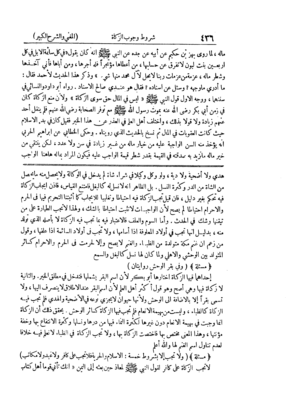 إنما وجبت في بهيمة الأنعام دون غيرها لكثرة النماء فيها من درها ونسلها وكثرة الانتفاع بها وخفة مؤنتها، وهذا المعنى مختص بها فاختصت الزكاة بها، ولا تجب الزكاة في الظباء لا نعلم فيه خلافا لعدم تناول اسم الغنم لها والله أعلم * (مسألة) * (ولا تجب إلا بشروط خمسة: الاسلام والحرية فلا تجب على كافر ولا عبد ولا مكاتب) لا تجب الزكاة على كافر لقول النبي صلى الله عليه وسلم لمعاذ حين بعثه إلى اليمن " إنك تأتي قوماً أهل كتاب