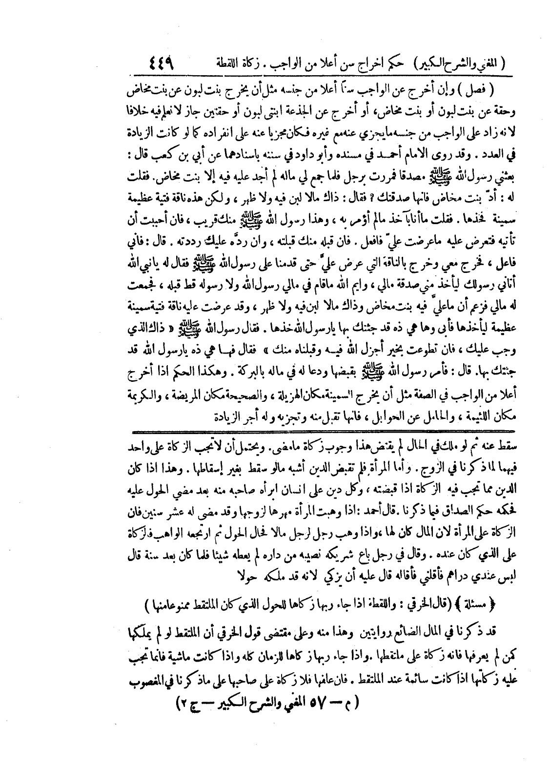 وقال في رجل باع شريكه نصيبه من داره لم يعطه شيئاً فلما كان بعد سنة قال ليس عندي دراهم فأقلني فأقاله قال عليه أن يزكي لأنه قد ملكه حولا * (مسألة) * (قال الخرقي: واللقطة إذا جاء ربها زكاها للحول الذي كان الملتقط ممنوعاً منها) قد ذكرنا في المال الضائع روايتين وهذا منه وعلى مقتضى قول الخرقي أن الملتقط لو لم يملكها كمن لم يعرفها فانه زكاة على ملتقطها.