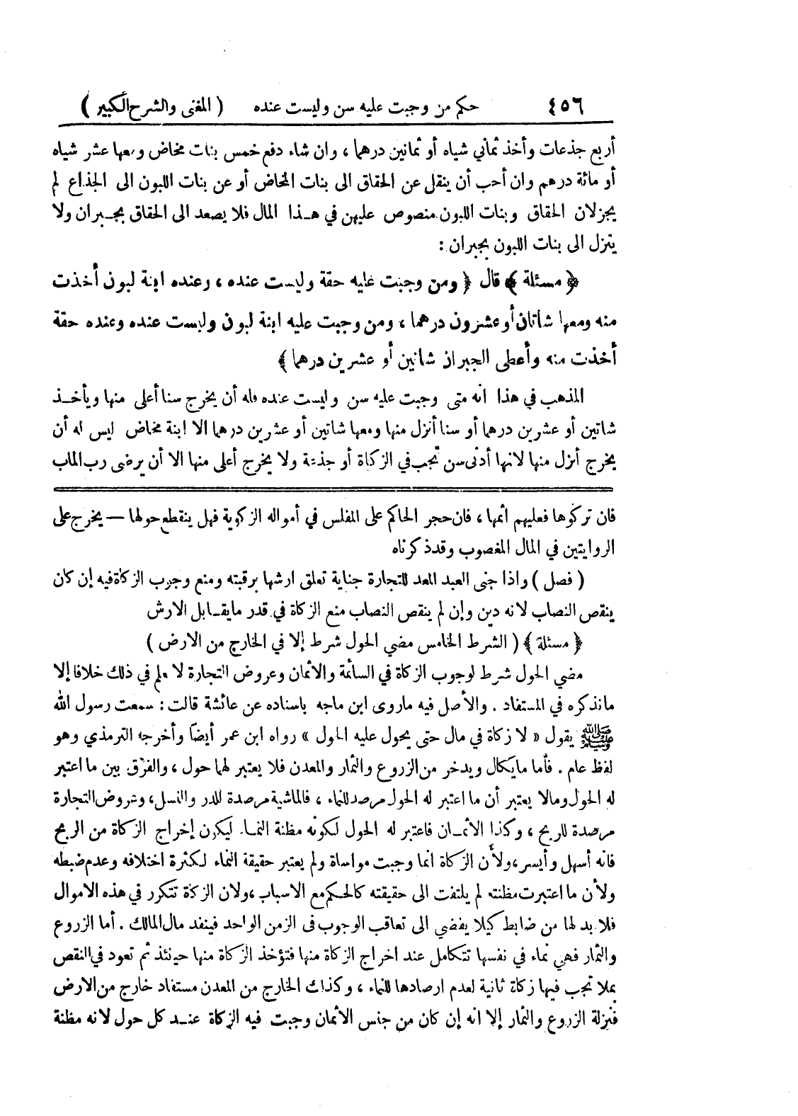 فان تركوها فعليهم اثمها، فان حجر الحاكم على المفلس في أمواله الزكوية فهل ينقطع حولها - يخرج على الروايتين في المال المغصوب وقد ذكرناه (فصل) وإذا جنى العبد المعد للتجارة جناية تعلق أرشها برقبته ومنع وجوب الزكاة فيه إن كان ينقص النصاب لانه دين وان لم ينقص النصاب منع الزكاة في قدر ما يقابل الارش * (مسألة) * (الشرط الخامس مضي الحول شرط إلا في الخارج من الأرض) مضي الحول شرط لوجوب الزكاة في السائمة والاثمان وعروض التجارة لا يعلم في ذلك خلافا إلا ما نذكره في المستفاد.