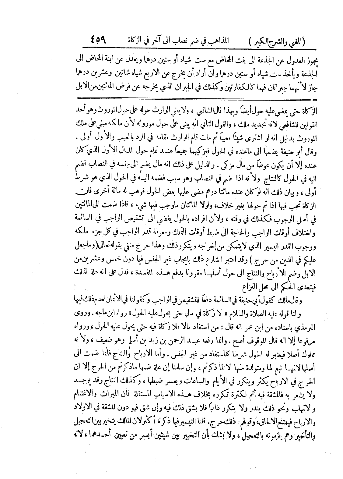 في أصل الوجوب فكذلك في وقته، ولأن افراده بالحول يفضي الى تشقيص الواجب في السائمة واختلاف أوقات الواجب والحاجة الى ضبط أوقات التملك ومعرفة قدر الواجب في كل جزء ملكه ووجوب القدر اليسير الذي لا يتمكن من إخراجه ويتكرر ذلك وهذا حرج منفي بقوله تعالى (وما جعل عليكم في الدين من حرج) وقد اعتبر الشارع ذلك بايجاب غير الجنس فيما دون خمس وعشرين من الابل وضم الأرباح والنتاج الى حول أصلها مقرونا بدفع هذه المفسدة، فدل على أنه علة لذلك فيتعدى الحكم إلى محل النزاع وقال مالك كقول أبي حنيفة في السائمة دفعاً للتشقيص في الواجب وكقولنا في الاثمان لعدم ذلك فيها ولنا قوله عليه الصلاة والسلام " لا زكاة في مال حتى يحول عليه الحول " رواه ابن ماجه.