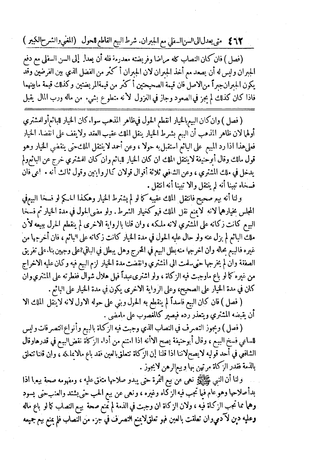(فصل) وإن كان البيع بالخيار انقطع الحول في ظاهر المذهب سواء كان الخيار للبائع أو للمشتري أو لهما لأن ظاهر المذهب أن البيع بشرط الخيار ينقل الملك عقيب العقد ولا يقف على انقضاء الخيار فعلى هذا إذا رد المبيع على البائع استقبل به حولا، وعن أحمد لا ينتقل الملك حتى ينقضي الخيار وهو قول مالك وقال أبو حنيفة لا ينتقل الملك إن كان الخيار للبائع وإن كان للمشتري خرج عن البائع ولم يدخل في ملك المشتري، وعن الشافعي ثلاثة أقوال قولان كالروايتين وقول ثالث أنه م؟ اعى فان فسخاه تبينا أنه لم ينتقل وإلا تبينا أنه انتقل.