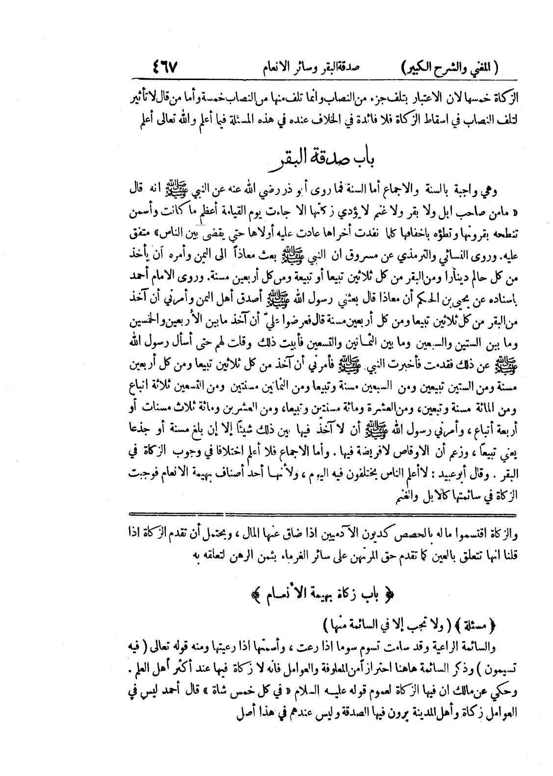 والزكاة اقتسموا ماله بالحصص كديون الآدميين إذا ضاق عنها المال، ويحتمل أن تقدم الزكاة إذا قلنا إنها تتعلق بالعين كما تقدم حق المرتهن على سائر الغرماء بثمن الرهن لتعلقه به * (باب زكاة بهيمة الأنعام) * * (مسألة) * (ولا تجب إلا في السائمة منها) والسائمة الراعية وقد سامت تسوم سوما اذا رعت، وأسمتها اذا رعيتها ومنه قوله تعالى (فيه تسيمون) وذكر السائمة هاهنا احترازاً من المعلوفة والعوامل فانه لا زكاة فيها عند أكثر أهل العلم.