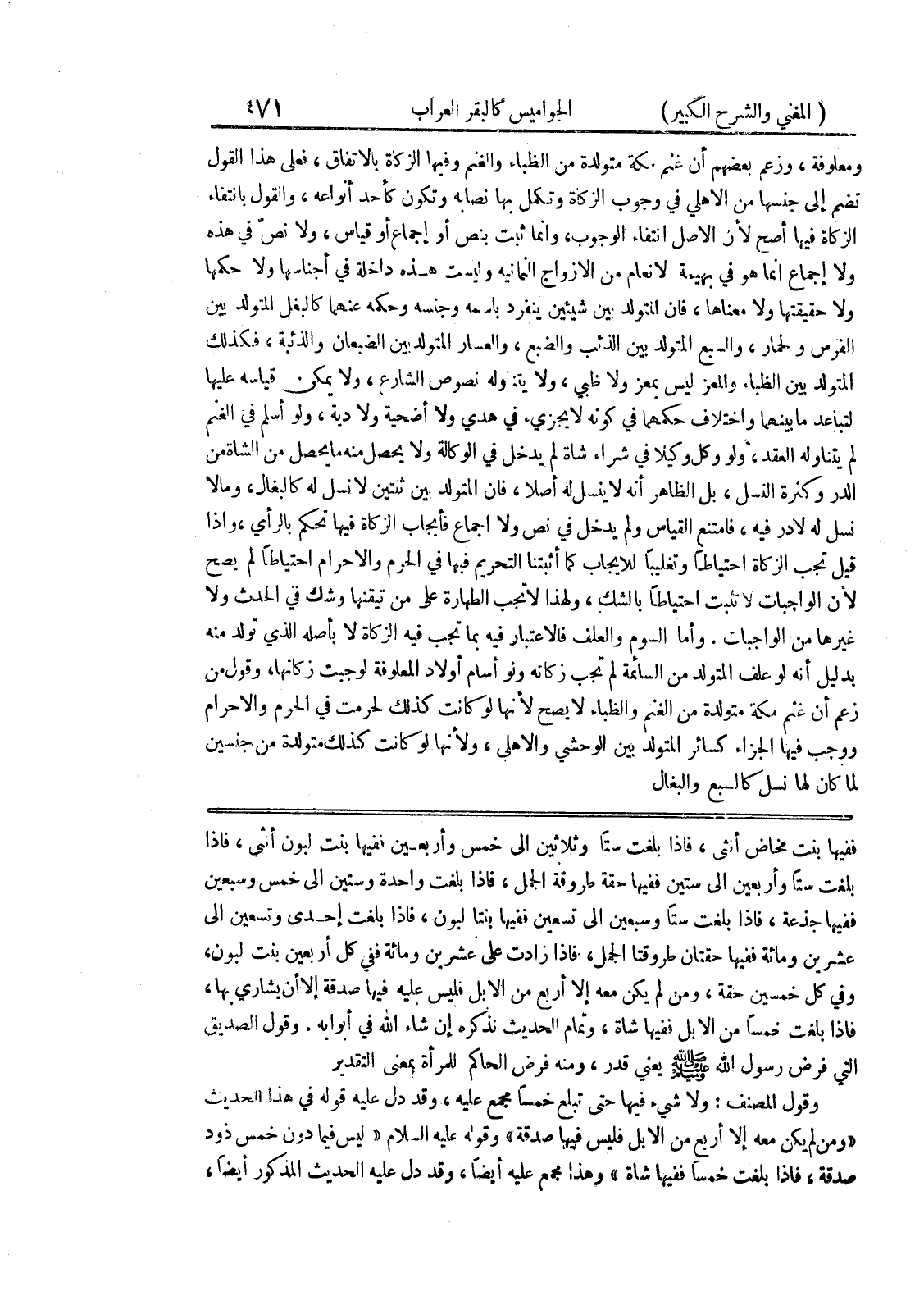 ففيها بنت مخاض أنثى، فإذا بلغت ستاً وثلاثين إلى خمس وأربعين ففيها بنت لبون أنثى، فإذا بلغت ستاً وأربعين إلى ستين ففيها حقة طروقة الجمل، فإذا بلغت واحدة وستين إلى خمس وسبعين ففيها جذعة، فإذا بلغت ستاً وسبعين إلى تسعين ففيها بنتا لبون، فإذا بلغت إحدى وتسعين إلى عشرين ومائة ففيها حقتان طروقتها الجمل، فإذا زادت على عشرين ومائة ففي كل أربعين بنت لبون، وفي كل خمسين حقة، ومن لم يكن معه إلا أربع من الإبل فليس عليه فيها صدقه إلا أن يشاري بها، فإذا بلغت خمساً من الإبل ففيها شاة، وتمام الحديث نذكره إن شاء الله في أبوابه.