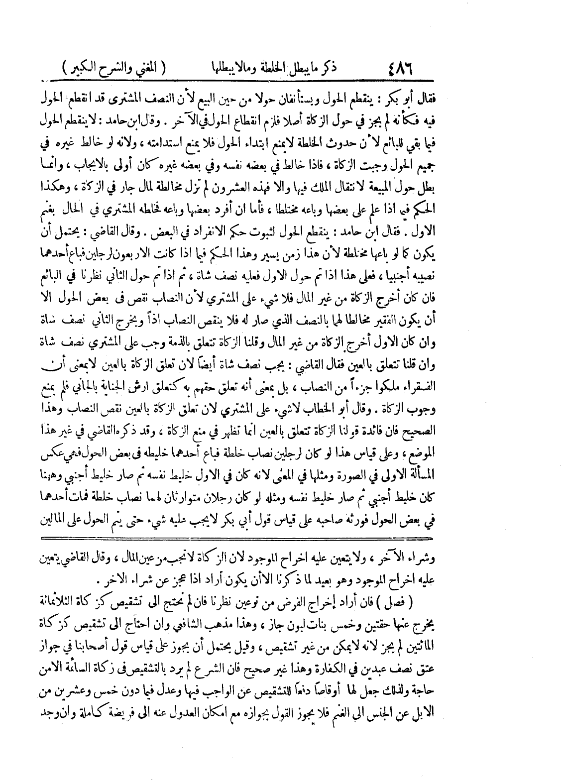 (فصل) فإن أراد إخراج الفرض من نوعين نظرنا فإن لم نحتج الى تشقيص كزكاة الثلاثمائة يخرج عنها حقتين وخمس بنات لبون جاز، وهذا مذهب الشافعي وإن احتاج الى تشقيص كزكاة المائتين لم يجز لأنه لا يمكن من غير تشقيص، وقيل يحتمل أن يجوز على قياس قول أصحابنا في جواز عتق نص عبدين في الكفارة وهذا غير صحيح فإن الشرع لم يرد بالتشقيص في زكاة السائمة إلا من حاجة ولذلك جعل لها أوقاصاً دفعاً للتشقيص عن الواجب فيها وعدل فيما دون خمس وعشرين من الابل عن الجنس الى الغنم فلا يجوز القول بجوازه مع امكان العدول عنه إلى فريضة كاملة وإن وجد