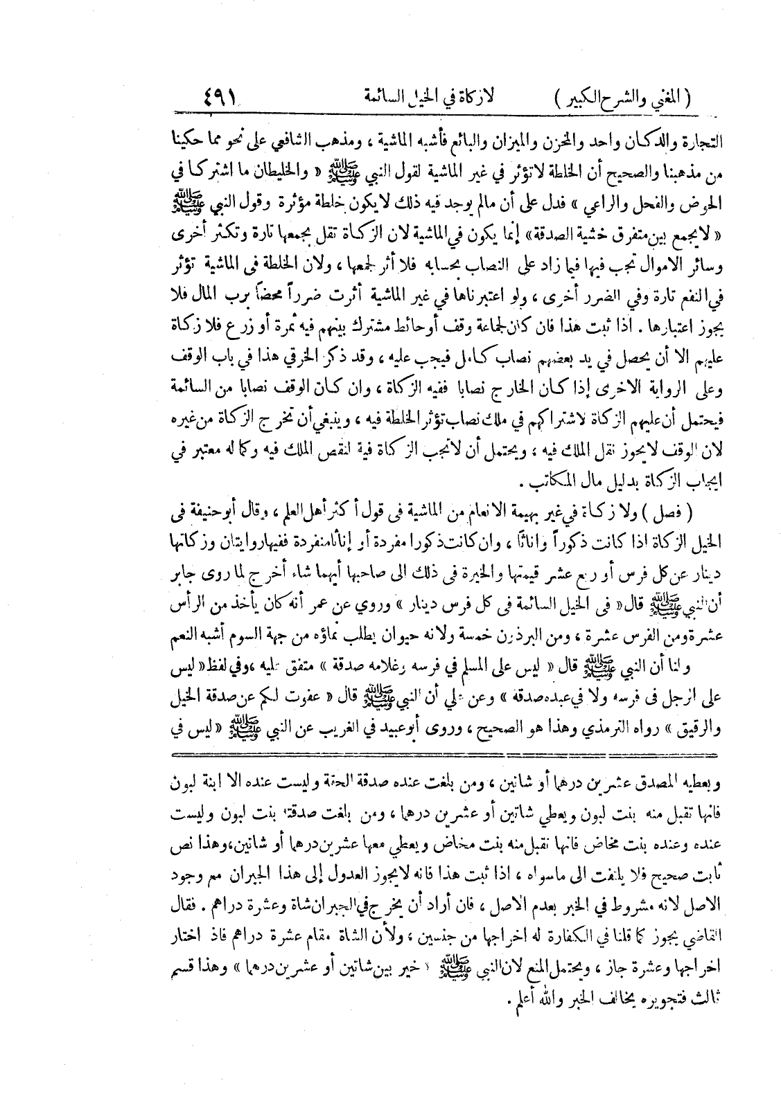 وبعطيه المصدق عشرين درهما أو شاتين، ومن بلغت عنده صدقة الحقة وليست عنده الا ابنة لبون فانها تقبل منه بنت لبون ويعطي شاتين أو عشرين درهما، ومن بلغت صدقته بنت لبون وليست عنده وعنده بنت مخاض فانها نقبل منه بنت مخاض ويعطي معها عشرين درهما أو شاتين، وهذا نص ثابت صحيح فلا يلتفت الى ما سواه، إذا ثبت هذا فإنه لا يجوز العدول إلى هذا الجبران مع وجود الاصل لانه مشروط في الخبر بعدم الاصل، فإن أراد أن يخرج في الجبران شاة وعشرة دراهم.