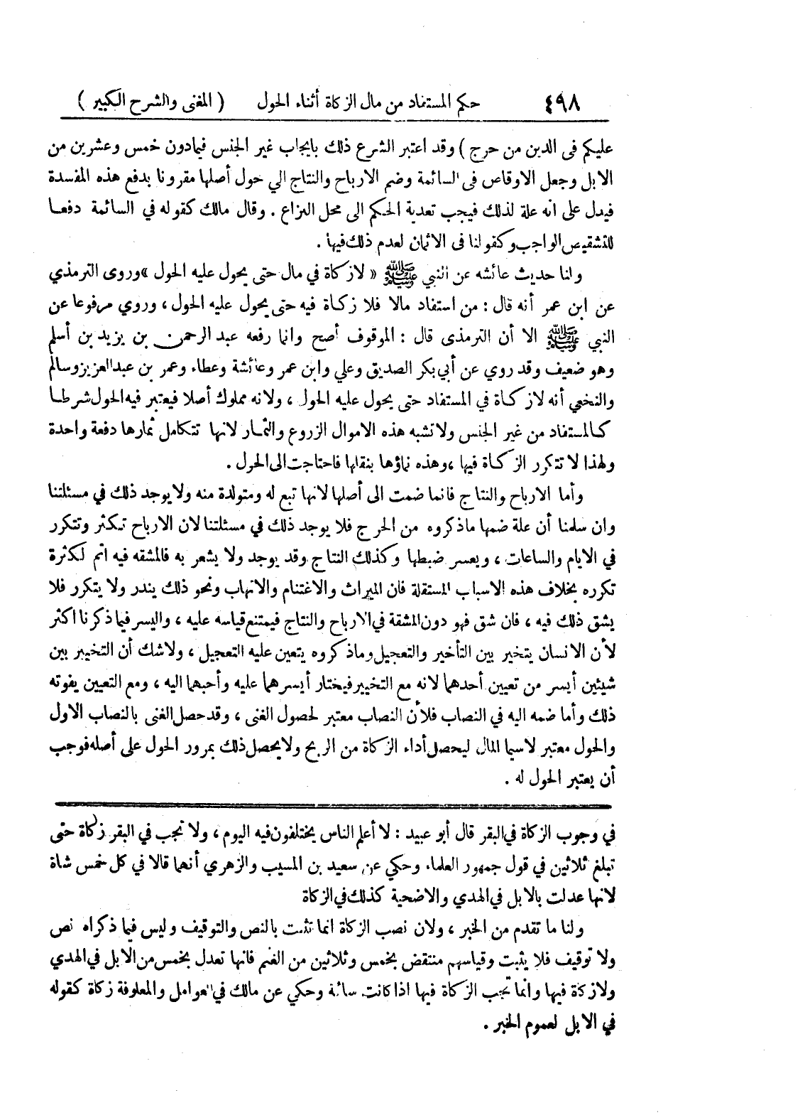 في وجوب الزكاة في البقر قال أبو عبيد: لا أعلم الناس يختلفون فيه اليوم، ولا تجب في البقر زكاة حتى تبلغ ثلاثين في قول جمهور العلماء وحكي عن سعيد بن المسيب والزهري أنهما قالا في كل خمس شاة لانها عدلت بالابل في الهدي والأضحية كذلك في الزكاة ولنا ما تقدم من الخبر، ولأن نصب الزكاة انما تثبت بالنص والتوقيف وليس فيما ذكراه نص ولا توقيف فلا يثبت وقياسهم منتقض بخمس وثلاثين من الغنم فانها تعدل بخمس من الإبل في الهدي ولا زكاة فيها وانما تجب الزكاة فيها إذا كانت سائمة وحكي عن مالك في العوامل والمعلوفة زكاة كقوله في الإبل لعموم الخبر.