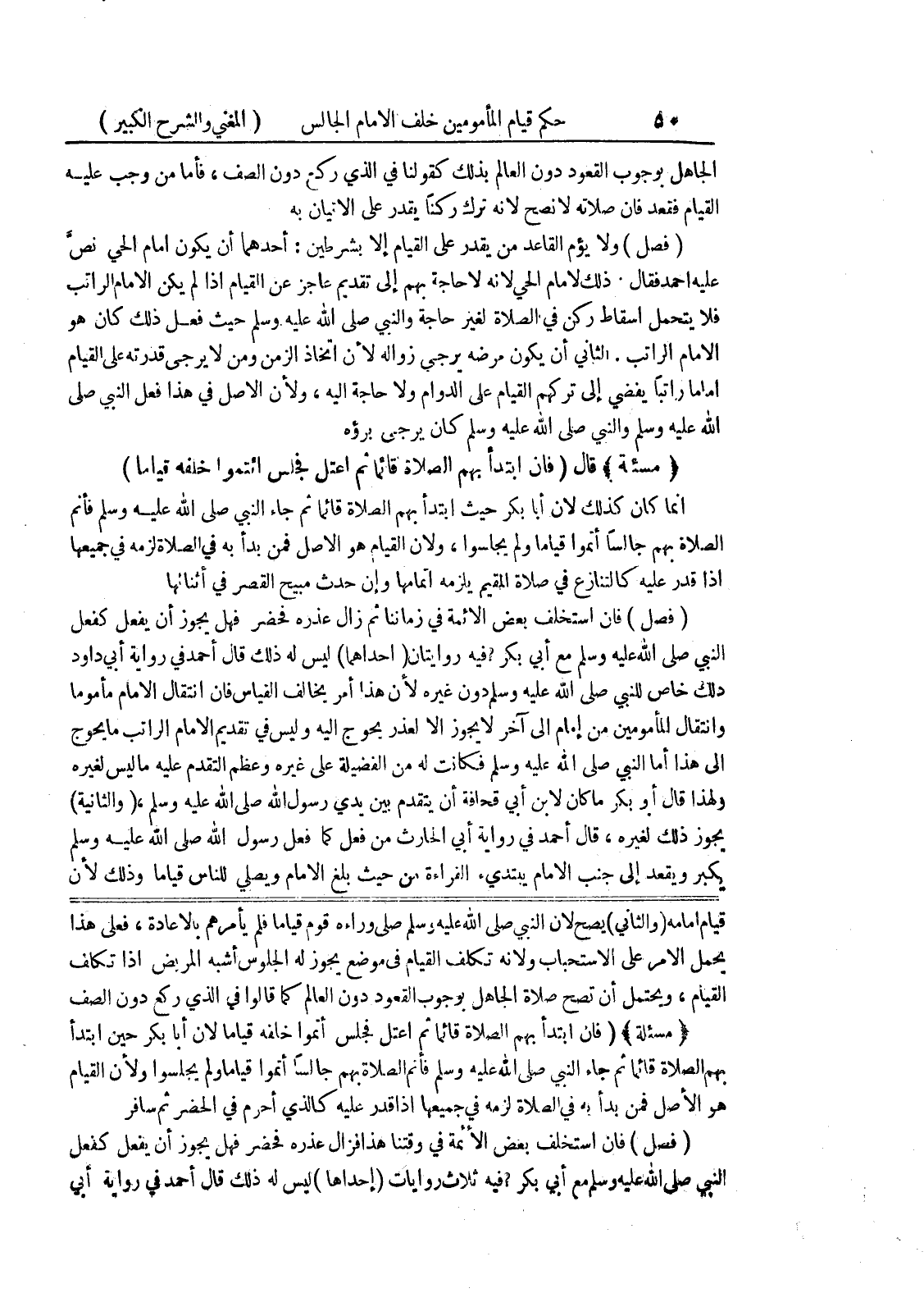 قيام إمامه (والثاني) يصح لأن النبي صلى الله عليه وسلم صلى وراءه قوم قياماً فلم يأمرهم بالإعادة، فعلى هذا يحمل الأمر على الاستحباب ولأنه تكلف القيام في موضع يجوز له الجلوس أشبه المريض اذا تكلف القيام، ويحتمل أن تصح صلاة الجاهل بوجوب القعود دون العالم كما قالوا في الذي ركع دون الصف * (مسألة) * (فان ابتدأ بهم الصلاة قائماً ثم اعتل فجلس أتموا خلفه قياماً لأن أبا بكر حين ابتدأ بهم الصلاة قائماً ثم جاء النبي صلى الله عليه وسلم فأتم الصلاة بهم جالساً أتموا قياماً ولم يجلسوا ولأن القيام هو الأصل فمن بدأ به في الصلاة لزمه في جميعها إذا قدر عليه كالذي أحرم في الحضر ثم سافر (فصل) فان استخلف بعض الأئمة في وقتنا هذا فزال عذره فحضر فهل يجوز أن يفعل كفعل النبي صلى الله عليه وسلم مع أبي بكر؟ فيه ثلاث روايات (إحداها) ليس له ذلك قال أحمد في رواية أبي