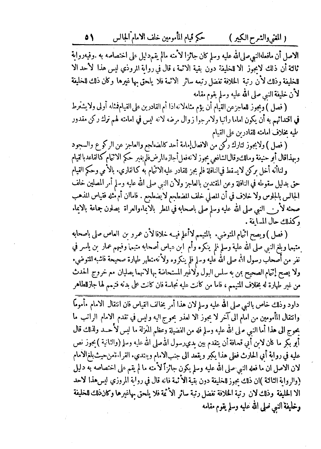 داود وذلك خاص بالنبي صلى الله عليه وسلم لأن هذا أمر يخالف القياس فان انتقال الامام مأموماً وانتقال المأمومين من إمام الى آخر لا يجوز إلا لعذر يحوج اليه وليس في تقدم الامام الراتب ما يحوج الى هذا أما النبي صلى الله عليه وسلم فانه من الفضيلة وعظم المنزلة ما ليس لأحد ولذلك قال أبو بكر ما كان لابن أبي قحافة أن يتقدم بين يدي رسول الله صلى الله عليه وسلم (والثانية) يجوز نص عليه في رواية أبي الحارث فعلى هذا يكبر ويقعد الى جنب الامام ويبتدئ القراءة من حيث بلغ الامام لأن الأصل أن ما فعله النبي صلى الله عليه وسلم يكون جائزاً لأمته ما لم يقم على اختصاصه به دليل (والرواية الثالثة) إن ذلك يجوز للخليفة دون بقية الأئمة فإنه قال في رواية المروزي ليس هذا لأحد إلا الخليفة وذلك لأن رتبة الخلافة تفضل رتبة سائر الأئمة فلا يلحق بها غيرها وكان ذلك للخليفة وخليفة النبي صلى الله عليه وسلم يقوم مقامه