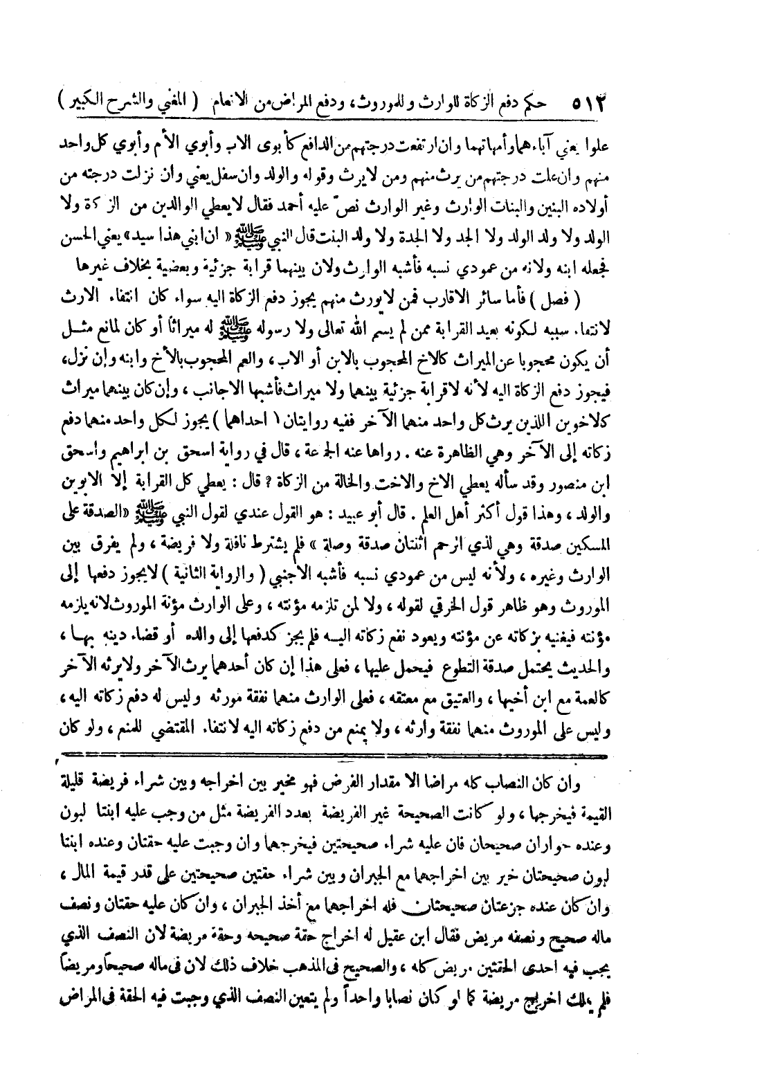 وان كان النصاب كله مراضا الا مقدار الفرض فهو مخير بين اخراجه وبين شراء فريضة قليلة القيمة فيخرجها، ولو كانت الصحيحة غير الفريضة بعدد الفريضة مثل من وجب عليه ابنتا لبون وعنده حواران صحيحان فان عليه شراء صحيحتين فيخرجهما وان وجبت عليه حقتان وعنده ابنتا لبون صحيحتان خير بين اخراجهما مع الجبران وبين شراء حقتين صحيحتين على قدر قيمة المال، وان كان عنده جزعتان صحيحتان فله اخراجهما مع أخذ الجبران، وان كان عليه حقتان ونصف ماله صحيح ونصفه مريض فقال ابن عقيل له اخراج حقة صحيحة وحقة مريضة لأن النصف الذي يجب فيه احدى الحقتين مريض كله، والصحيح في المذهب خلاف ذلك لأن في ماله صحيحاً ومريضاً فلم يملك اخراج مريضة كما لو كان نصابا واحداً ولم يتعين النصف الذي وجبت فيه الحقة في المراض