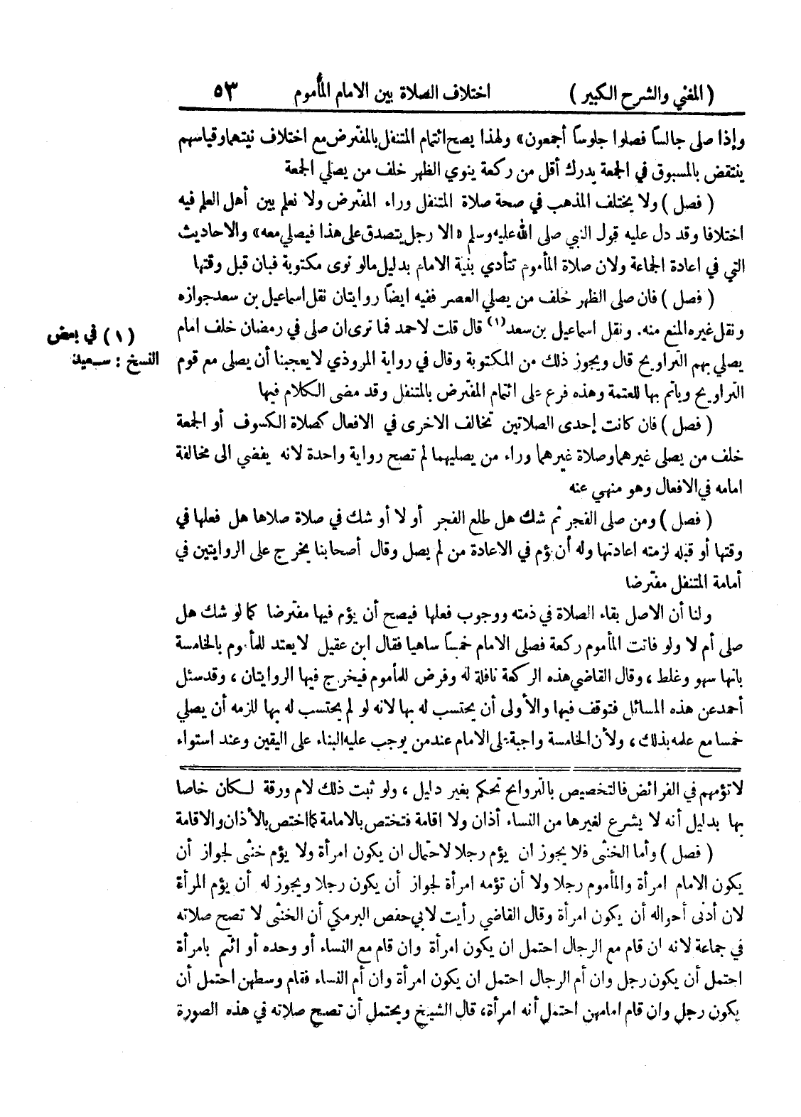 لا تؤمهم في الفرائض فالتخصيص بالتروايح تحكم بغير دليل، ولو ثبت ذلك لأم ورقة لكان خاصاً بها بدليل أنه لا يشرع لغيرها من النساء اذان ولا إقامة فتختص بالامامة كما اختص بالأذان والإقامة (فصل) وأما الخنثى فلا يجوز أن يؤم رجلاً لاحتمال أن يكون امرأة ولا يؤم خنثى لجواز أن يكون الامام امرأة والمأموم رجلاً ولا أن تؤمه امرأة لجواز أن يكون رجلاً ويجوز له أنه يؤم المرأة لأن أدنى أحواله أن يكون امرأة وقال القاضي رأيت لأبي حفص البرمكي أن الخنثى لا تصح صلاته في جماعة لأنه إن قام مع الرجال احتمل أن يكون امرأة وان قام مع النساء أو وحده أو ائتم بامرأة احتمل أن يكون رجل وان أم الرجال احتمل أن يكون امرأة وان أم النساء فقام وسطهن احتمل أن يكون رجل وان قام أمامهن احتمل أنه امرأة، قال الشيخ ويحتمل أن تصح صلاته في هذه الصورة