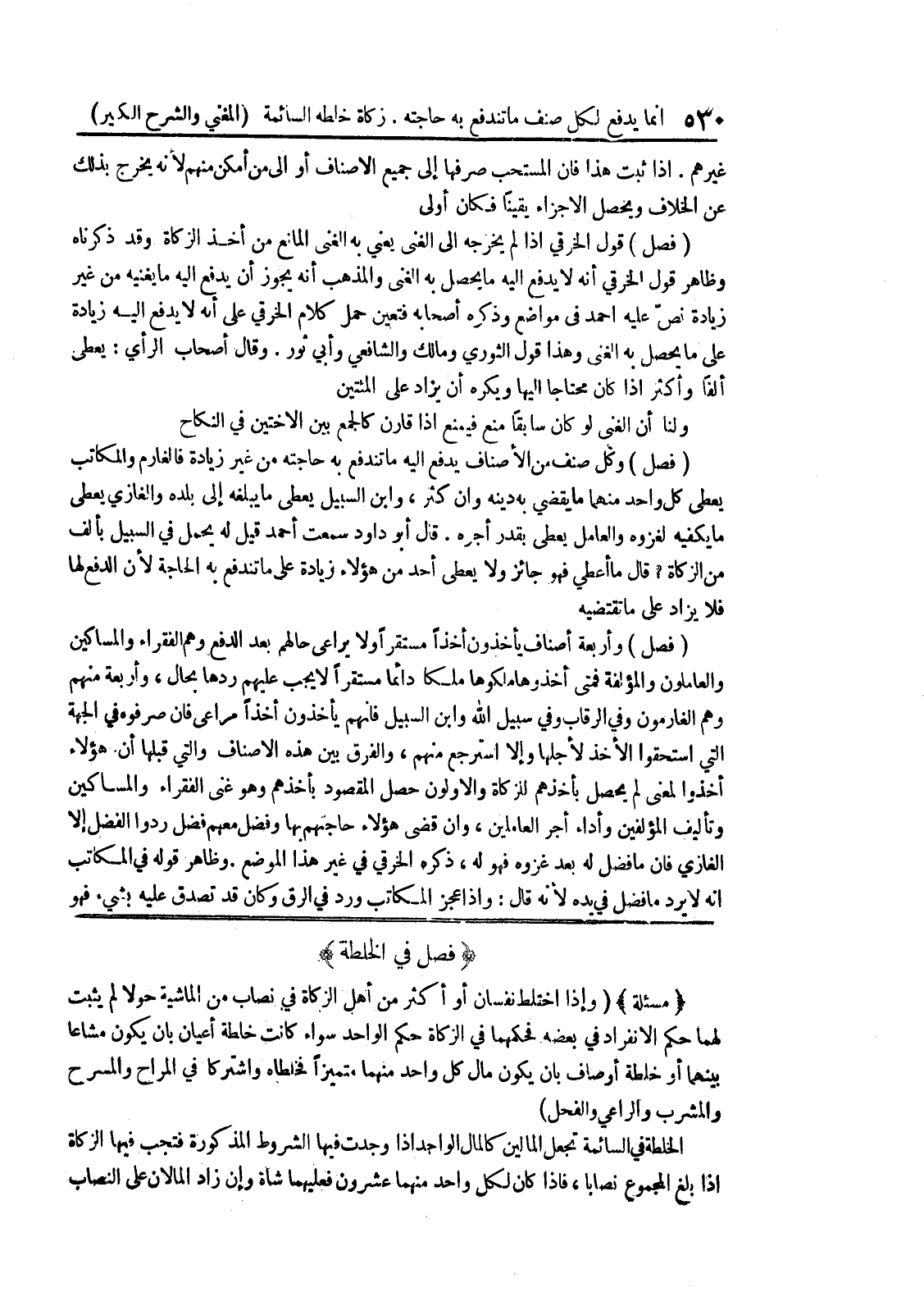 * (فصل في الخلطة) * * (مسألة) * (وإذا اختلط نفسان أو أكثر من أهل الزكاة في نصاب من الماشية حولا لم يثبت لهما حكم الانفراد في بعضه فحكمها في الزكاة حكم الواحد سواء كانت خلطة أعيان بأن يكون مشاعا بينهما أو خلطة أوصاف بأن يكون مال كل واحد منهما متميزاً فخلطاه واشتركا في المراح والمسرح والمشرب والراعي والفحل) الخلفة في السائمة تجعل المالين كالمال الواحد اذا وجدت فيها الشروط المذكورة فتجب فيها الزكاة اذا بلغ المجموع نصابا، فاذا كان لكل واحد منهما عشرون فعليهما شاة وإن زاد المالان على النصاب
