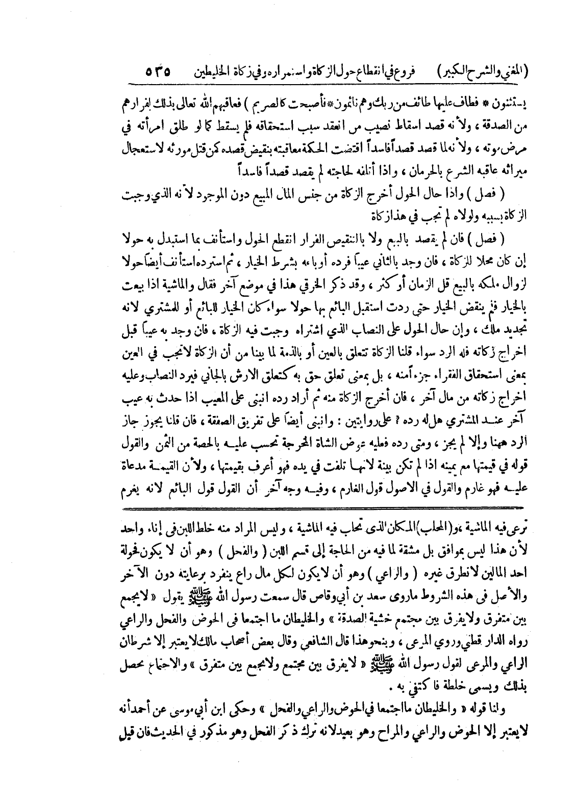 لأن هذا ليس بموافق بل مشقة لما فيه من الحاجة إلى قسم اللبن (والفحل) وهو أن لا يكون فحولة احد المالين لا نطرق غيره (والراعي) وهو أن لا يكون لكل مال راع ينفرد برعايته دون الآخر والأصل في هذه الشروط ما روى سعد بن أبي وقاص قال سمعت رسول الله صلى الله عليه وسلم يقول " لا يجمع بين متفرق ولا يفرق بين مجتمع خشية الصدقة " والخليطان ما اجتمعا في الحوض والفحل والراعي رواه الدارقطني وروي المرعى، وبنحو هذا قال الشافعي وقال بعض أصحاب مالك لا يعتبر إلا شرطان الراعي والمرعى لقول رسول الله صلى الله عليه وسلم " لا يفرق بين مجتمع ولا يجمع بين متفرق " والاجتماع يحصل بذلك ويسمى خلطة فاكتفي به.