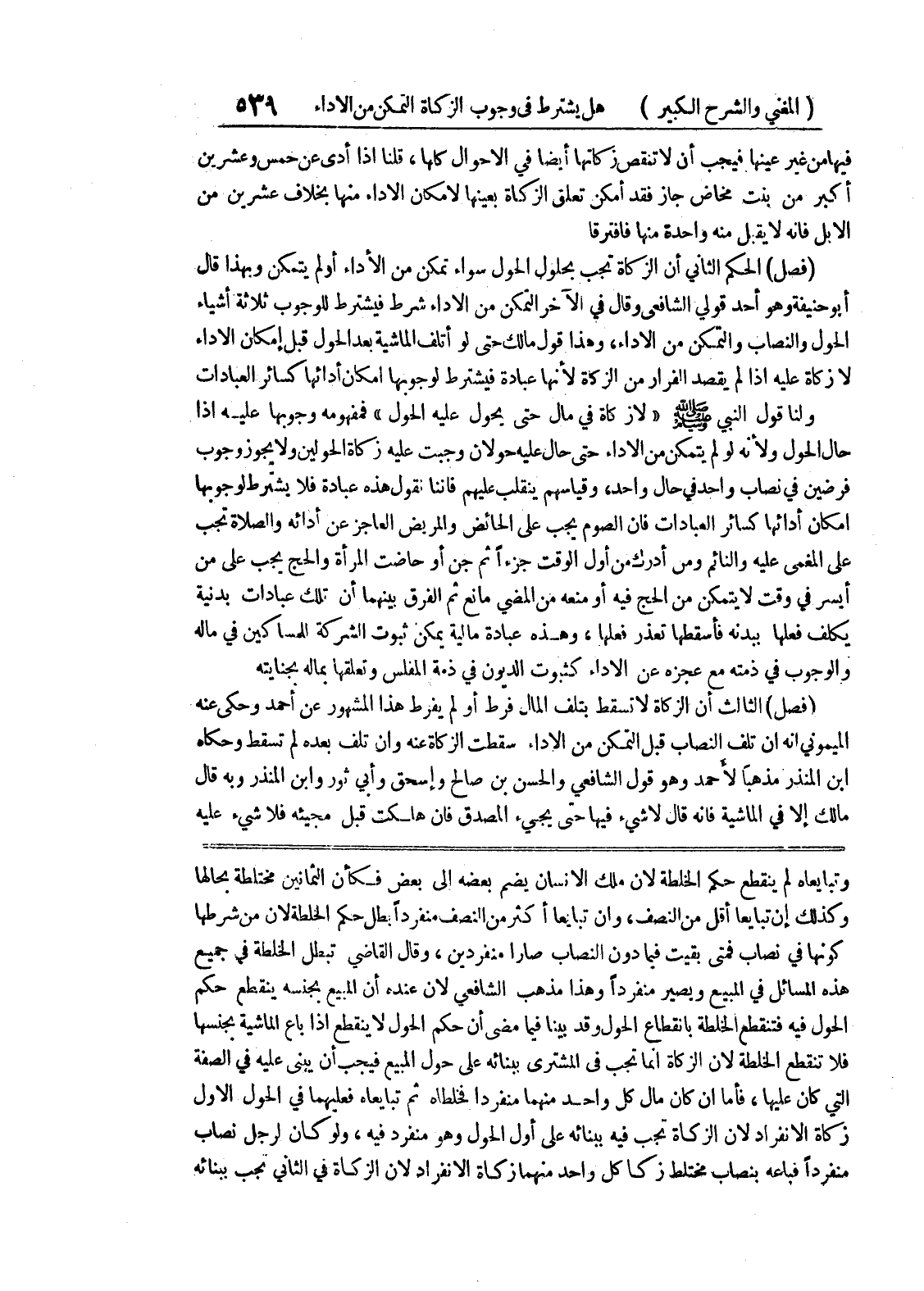 الحول فيه فتنقطع الخلطة بانقطاع الحول وقد بينا فيما مضى أن حكم الحول لا ينقطع اذا باع الماشية بجنسها فلا تنقطع الخلطة لأن الزكاة إنما تجب في المشترى ببنائه على حول المبيع فيجب أن يبنى عليه في الصفة التي كان عليها، فأما إن كان مال كل واحد منهما منفرداً فخلطاه ثم تبايعاه فعليهما في الحول الأول زكاة الانفراد لأن الزكاة تجب فيه ببنائه على أول الحول وهو منفرد فيه، ولو كان لرجل نصاب منفرداً فباعه بنصاب مختلط زكا كل واحد منهما زكاة الانفراد لان الزكاة في الثاني تجب ببنائه
