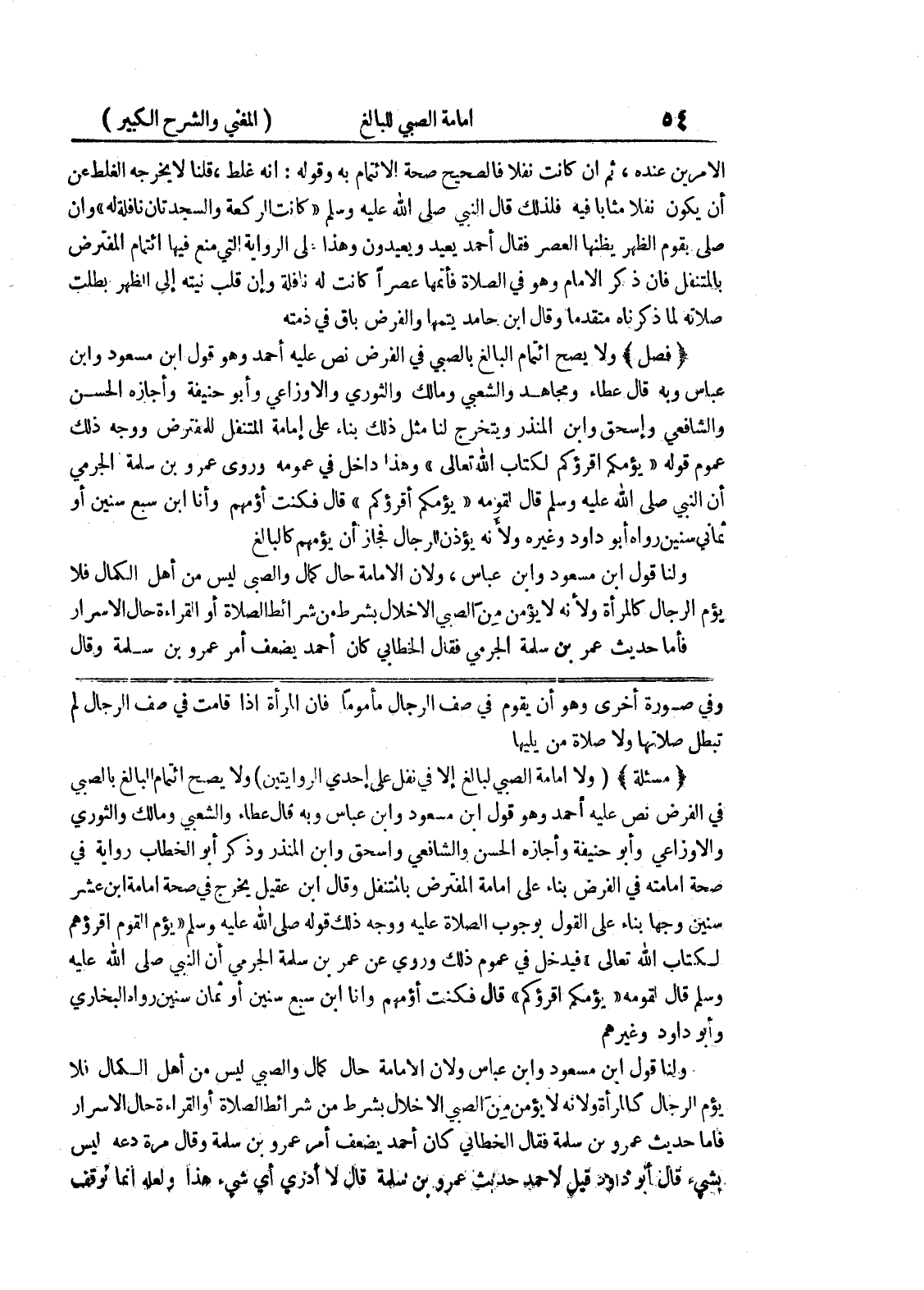وفي صورة أخرى وهو أن يقوم في صف الرجال مأموماً فإن المرأة إذا قامت في صف الرجال لم تبطل صلاتها ولا صلاة من يليها * (مسألة) * (ولا إمامة الصبي لبالغ إلا في نفل على إحدى الروايتين) ولا يصح ائتمام البالغ بالصبي في الفرض نص عليه أحمد وهو قول ابن مسعود وابن عباس وبه قال عطاء والشعبي ومالك والثوري