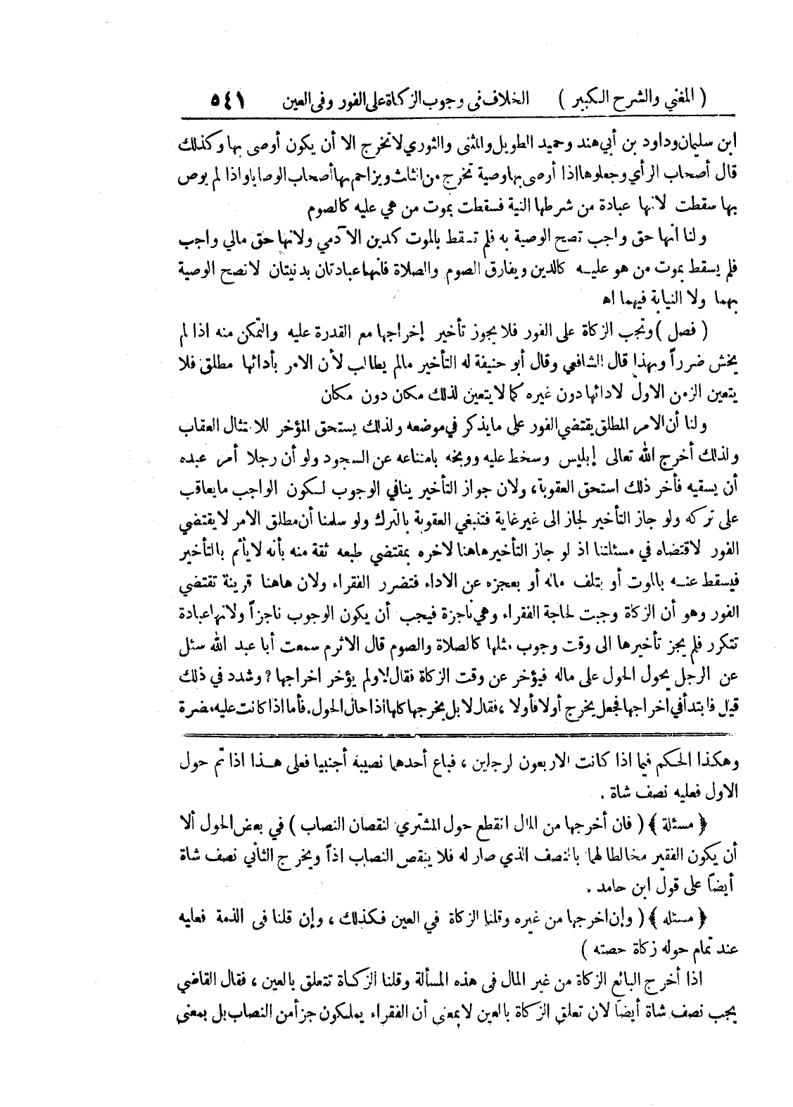 * (مسألة) * (فان أخرجها من المال انقطع حول المشتري لنقصان النصاب) في بعض الحول إلا أن يكون الفقير مخالطا لهما بالنصف الذي صار له فلا ينقص النصاب اذاً ويخرج الثاني نصف شاة أيضاً على قول ابن حامد.