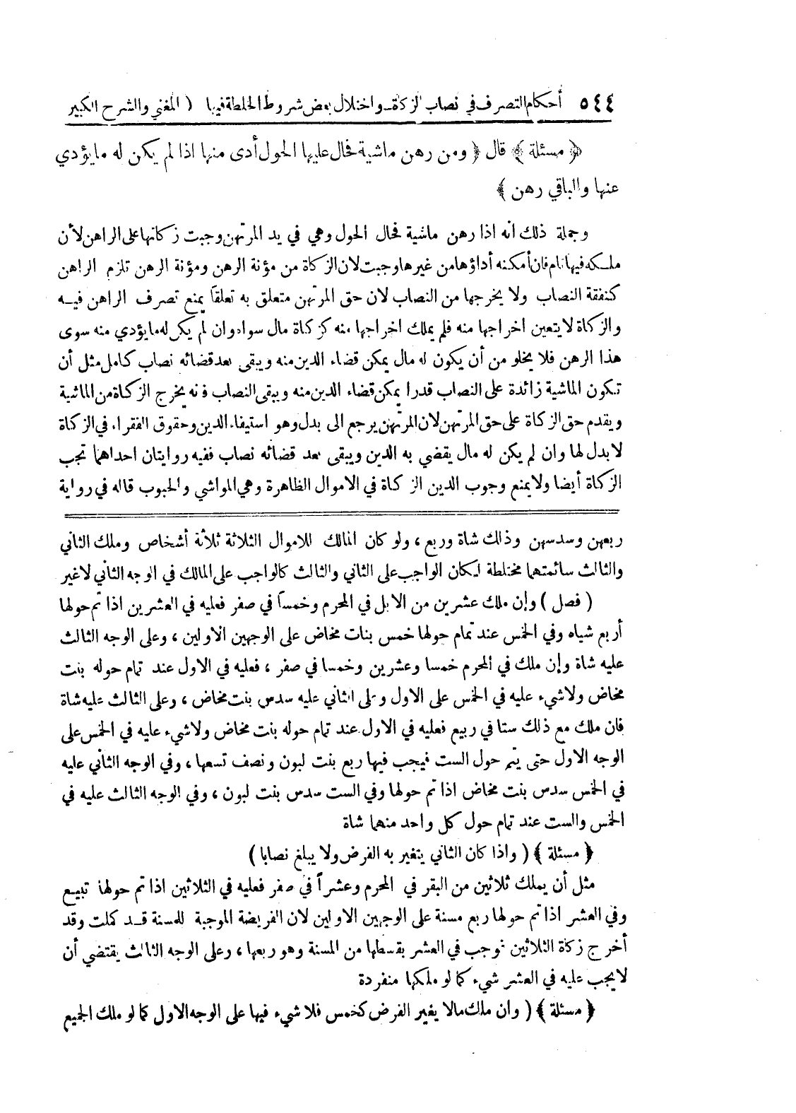 عليه شاة وإن ملك في المحرم خمسا وعشرين وخمسا في صفر، فعليه في الاول عند تمام حوله بنت مخاض ولا شئ عليه في الخمس على الأول وعلى الثاني عليه سدس بنت مخاض، وعلى الثالث عليه شاة فان ملك مع ذلك ستا في ربيع فعليه في الأول عند تمام حوله بنت مخاض ولا شئ عليه في الخمس على الوجه الأول حتى يتم حول الست فيجب فيها ربع بنت لبون ونصف تسعها، وفي الوجه الثاني عليه في الخمس سدس بنت مخاض إذا تم حولها وفي الست سدس بنت لبون، وفي الوجه الثالث عليه في الخمس والست عند تمام حول كل واحد منهما شاة * (مسألة) * (وإذا كان الثاني يتغير به الفرض ولا يبلغ نصابا) مثل أن يملك ثلاثين من البقر في المحرم وعشراً في صفر فعليه في الثلاثين اذا تم حولها تبيع وفي العشر اذا تم حولها ربع مسنة على الوجهين الاولين لان الفريضة الموجبة للمسنة قد كملت وقد أخرج زكاة الثلاثين فوجب في العشر بقسطها من المسنة وهو ربعها، وعلى الوجه الثالث يقتضي أن لا يجب عليه في العشر شئ كما لو ملكها منفردة * (مسألة) * (وإن ملك مالا يغير الفرض كخمس فلا شئ فيها على الوجه الأول كما لو ملك الجميع