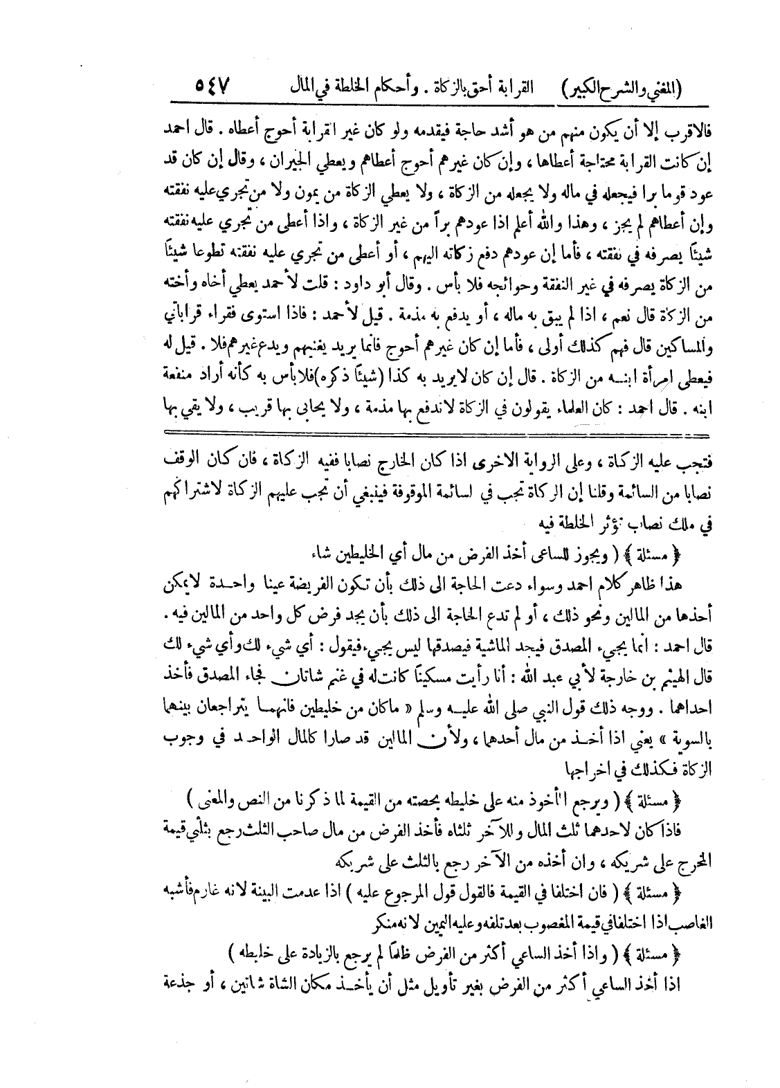فتجب عليه الزكاة، وعلى الرواية الأخرى اذا كان الخارج نصابا ففيه الزكاة، فإن كان الوقف نصابا من السائمة وقلنا إن الزكاة تجب في لسائمة الموقوفة فينبغي أن تجب عليهم الزكاة لا شتراكهم في ملك نصاب تؤثر الخلطة فيه * (مسألة) * (ويجوز للساعي أخذ الفرض من مال أي الخليطين شاء هذا ظاهر كلام أحمد وسواء دعت الحاجة الى ذلك بأن تكون الفريضة عيناً واحدة لا يمكن أخذها من المالين ونحو ذلك، أو لم تدع الحاجة إلى ذلك بأن يجد فرض كل واحد من المالين فيه.