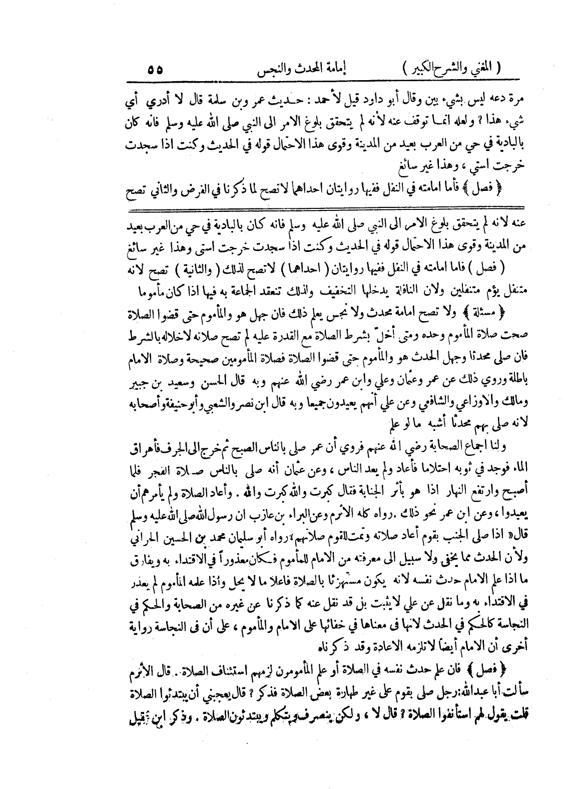 عنه لأنه لم يتحقق بلوغ الأمر إلى النبي صلى الله عليه وسلم فانه كان بالبادية في حي من العرب بعيد من المدينة وقوى هذا الاحتمال قوله في الحديث وكنت اذا سجدت خرجت استي وهذا غير سائغ (فصل) فاما إمامته في النفل ففيها روايتان (إحداهما) لا تصح لذلك (والثانية) تصح لأنه متنفل يؤم متنفلين ولأن النافلة يدخلها التخفيف ولذلك تنعقد الجماعة به فيها إذا كان مأموماً * (مسألة) * ولا تصح إمامة محدث ولا نجس يعلم ذلك فإن جهل هو والمأموم حتى قضوا الصلاة صحت صلاة المأموم وحده ومتى أخل بشرط الصلاة مع القدرة عليه لم تصح صلاته لاخلاله بالشرط فان صلى محدثاً وجهل الحدث هو والمأموم حتى قضوا الصلاة فصلاة المأمومين صحيحة وصلاة الامام باطلة وروي ذلك عن عمر وعثمان وعلي وابن عمر رضي الله عنهم وبه قال الحسن وسعيد بن جبير ومالك والاوزاعي والشافعي وعن علي أنهم يعيدون جميعاً وبه قال ابن نصر والشعبي وأبو حنيفة وأصحابه لأنه صلى بهم محدثاً أشبه ما لو علم ولنا إجماع الصحابة رضي الله عنهم فروي أن عمر صلى بالناس الصبح ثم خرج إلى الجرف فأهراق