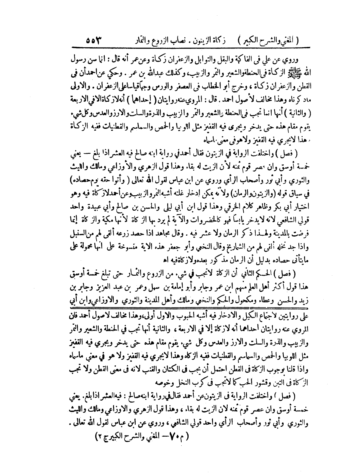 على روايتين لاجتماع الكيل والادخار فيه أشبه الجنوب والأول أولى، وهذا مخالف لاصول أحمد فان المروي عنه روايتان إحداهما أنه لا زكاة إلا في الأربعة، والثانية أنها تجب في الحنطة والشعير والتمر والزبيب والذرة والسلت والارز والعدس وكل شئ يقوم مقام هذه حتى يدخر ويجري فيه القفيز مثل اللوبيا والحمص والسماسم والقطنيات ففيه الزكاة وهذا لا يجري فيه القفيز ولا هو في معنى ما سماه واذا قلنا بوجوب الزكاة في القطن احتمل أن يجب في الكتان والقنب لأنه في معنى القطن ولا تجب الزكاة في التين وقشور الحب كما لا تجب في كرب النخل وخوصه (فصل) واختلفت الرواية في الزيتون عن أحمد فقال في رواية ابنه صالح: فيه العشر اذا بلغ.
