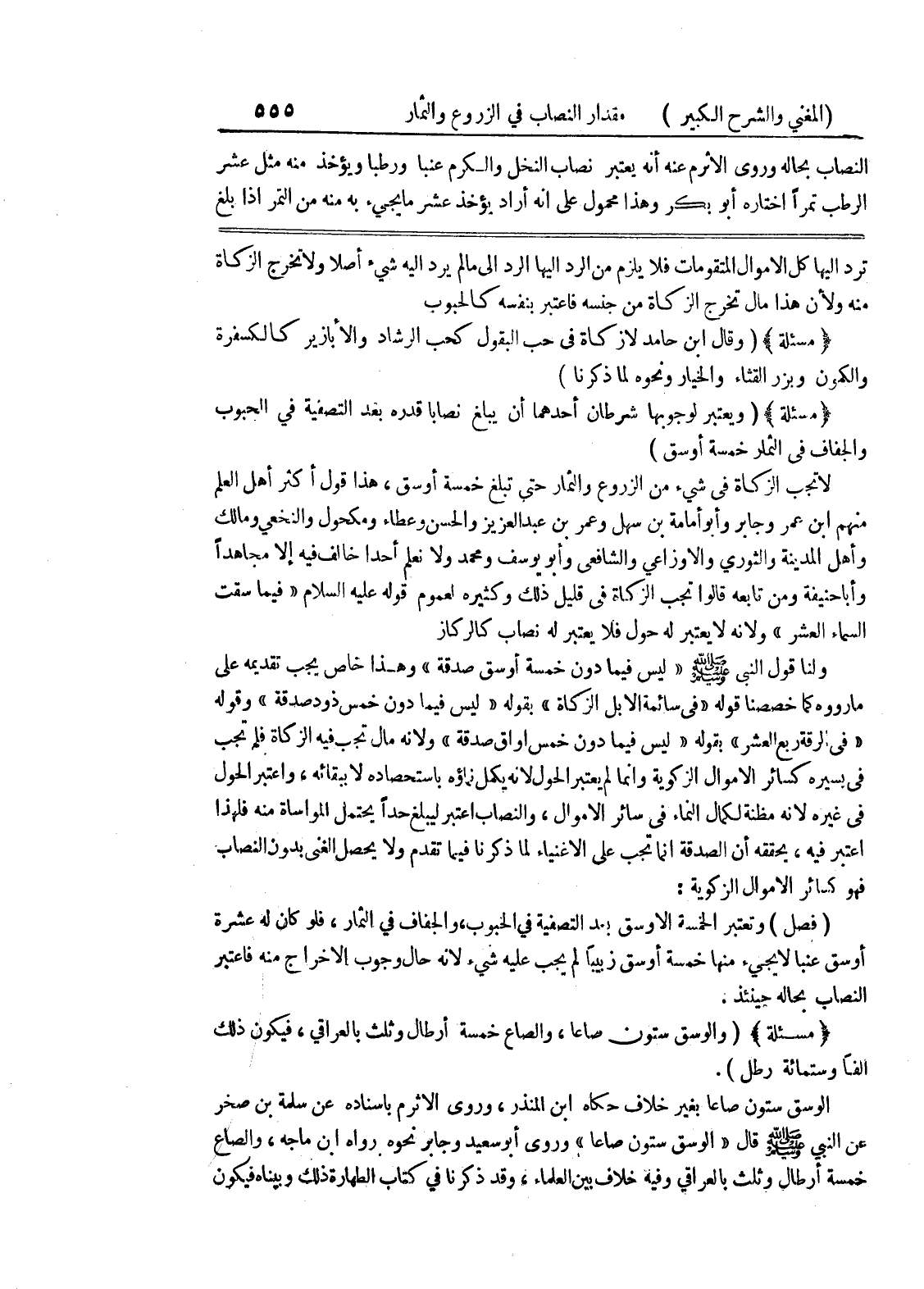 ترد اليها كل الاموال المتقومات فلا يلزم من الرد اليها الرد إلى ما لم يرد إليه شئ أصلا ولا تخرج الزكاة منه ولأن هذا مال تخرج الزكاة من جنسه فاعتبر بنفسه كالحبوب * (مسألة) * (وقال ابن حامد لا زكاة في حب البقول كحب الرشاد والأبازير كالكسفرة والكمون وبزر القثاء والخيار ونحوه لما ذكرنا) * (مسألة) * (ويعتبر لوجوبها شرطان أحدهما أن يبلغ نصابا قدره بعد التصفية في الحبوب والجفاف في الثمار خمسة أوسق) لا تجب الزكاة في شئ من الزروع والثمار حتى تبلغ خمسة أوسق، هذا قول أكثر أهل العلم منهم ابن عمر وجابر وأبو أمامة بن سهل وعمر بن عبد العزيز والحسن وعطاء ومكحول والنخعي ومالك وأهل المدينة والثوري والاوزاعي والشافعي وأبو يوسف ومحمد ولا نعلم احدا خالف فيه إلا مجاهدا وأبا حنيفة ومن تابعه قالوا تجب الزكاة في قليل ذلك وكثيره لعموم قوله عليه السلام " فيما سقت السماء العشر " ولأنه لا يعتبر له حول فلا يعتبر له نصاب كالركاز ولنا قول النبي صلى الله عليه وسلم " ليس فيما دون خمسة أوسق صدقة " وهذا خاص يجب تقديمه على ما رووه كما خصصنا قوله " في سائمة الإبل الزكاة " بقوله " ليس فيما دون خمس ذود صدقة " وقوله " في الرقة ربع العشر " بقوله " ليس فيما دون خمس أواق صدقة " ولانه مال تجب فيه الزكاة فلم تجب في يسيره كسائر الاموال الزكوية وانما لم يعتبر الحول لانه يكمل نماؤه باستحصاده لا ببقائه، واعتبر الحول في غيره لأنه مظنة لكمال النماء في سائر الاموال، والنصاب اعتبر ليبلغ حداً يحتمل المواساة منه فلهذا اعتبر فيه، يحققه إن الصدقة إنما تجب على الاغنياء لما ذكرنا فيما تقدم ولا يحصل الغنى بدون النصاب