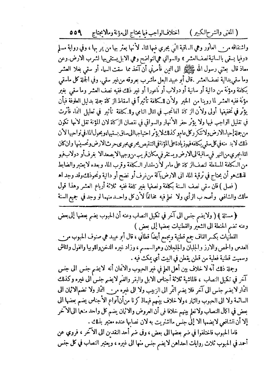 وجملة ذلك أنه لا خلاف بين أهل العلم في غير الحبوب والاثمان أنه لا يضم جنس إلى جنس آخر في تكميل النصاب، فالماشية ثلاثة أجناس الإبل والبقر والغنم لا يضم جنس إلى غيره وكذلك الثمار لا يضم جنس الى آخر فلا يضم التمر الى الزبيب ولا إلى غيره من الثمار ولا تضم الاثمان الى السائمة ولا الى الحبوب والثمار، ولا خلاف بينهم فيما ذكرنا من أن أنواع الأجناس يضم بعضها إلى بعض في الكمال النصاب ولا نعلم بينهم خلافاً في أن العروض والاثمان يضم كل واحد منهما الى الآخر إلا أن الشافعي لا يضمها الا إلى جنس ما اشتريت به لان نصابها عنده معتبر بذلك.