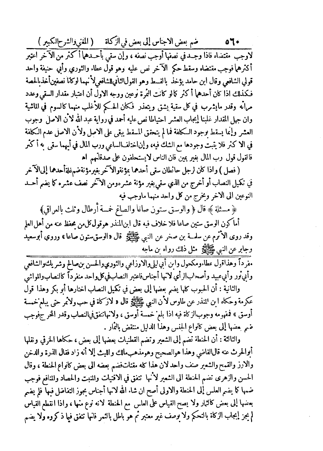 مفرداً وهذا قول عطاء ومكحول وابن أبي ليلى والاوزاعي والثوري والحين بن صالح وشريك والشافعي وأبي ثور وأبي عبيد وأصحاب الرأي لانها أجناس فاعتبر النصاب في كل واحد منفرداً كالنصاب والمواشي والثانية: أن الحبوب كلها يضم بعضها إلى بعض في تكميل النصاب اختارها أبو بكر وهذا قول عكرمة وحكاه ابن المنذر عن طاوس لأن النبي صلى الله عليه وسلم قال " لا زكاة في حب ولا ثمر حتى يبلغ خمسة أوسق " فمفهومه وجوب الزكاة فيه اذا بلغ خمسة أوسق، ولأنها تتفق في النصاب وقدر المخرج فوجب ضم بعضها إلى بعض كانواع الجنس وهذا الدليل منتقض بالثمار.