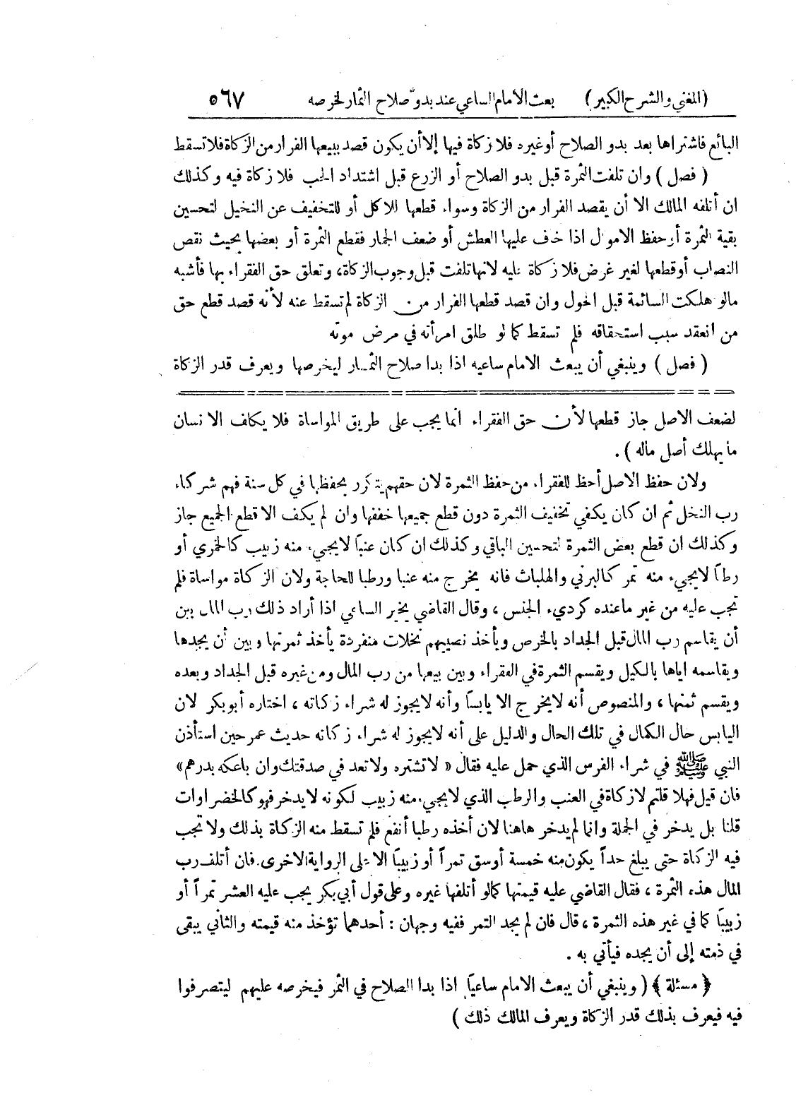 ولان حفظ الاصل أحظ للفقراء من حفظ الثمرة لان حقهم يتكرر بحفظها في كل سنة فهم شركاء رب النخل ثم إن كان يكفي تخفيف الثمرة دون قطع جميعها خففها وان لم يكف الا قطع الجميع جاز وكذلك إن قطع بعض الثمرة لتحسين الباقي وكذلك إن كان عنباً لا يجئ منه زبيب كالخمري أو رطا لا يجئ منه تمر كالبرني والهلبات فانه يخرج منه عنبا ورطباً للحاجة ولأن الزكاة مواساة فلم تجب عليه من غير ما عنده كردئ الجنس، وقال القاضي يخير الساعي اذا أردا ذلك رب المال بين أن يقاسم رب المال قبل الجداد بالخرص ويأخذ نصيبهم نخلات منفردة يأخذ ثمرتها وبين أن يجدها ويقاسمه اياها بالكيل ويقسم الثمرة في الفقراء وبين بيعها من رب المال ومن غيره قبل الجداد وبعده ويقسم ثمنها، والمنصوص أنه لا يخرج إلا يابساً وأنه لا يجوز له شراء زكاته، اختاره أبو بكر لان اليابس حال الكمال في تلك الحال والدليل على أنه لا يجوز له شراء زكاته حديث عمر حين استأذن النبي صلى الله عليه وسلم في شراء الفرس الذي حمل عليه فقال " لا تشتره ولا تعد في صدقتك وإن باعكه بدرهم " فإن قيل فهلا قلتم لا زكاة في العنب والرطب الذي لا يجئ منه زبيب لكونه لا يدخر فهو كالخضراوات قلنا بل يدخر في الجملة وإنما لم يدخر هاهنا لان أخذه رطبا أنفع فلم تسقط منه الزكاة بذلك ولا تجب فيه الزكاة حتى يبلغ حداً يكون منه خمسة أوسق تمراً أو زبيباً إلا على الرواية الأخرى فان أتلف رب المال هذه الثمرة، فقال القاضي عليه قيمتها كما لو أتلفها غيره وعلى قول أبي بكر يجب عليه العشر تمراً أو زبيباً كما في غير هذه الثمرة، قال فإن لم يجد التمر ففيه وجهان: أحدهما تؤخذ منه قيمته والثاني يبقى في ذمته إلى أن يجده فيأتي به.