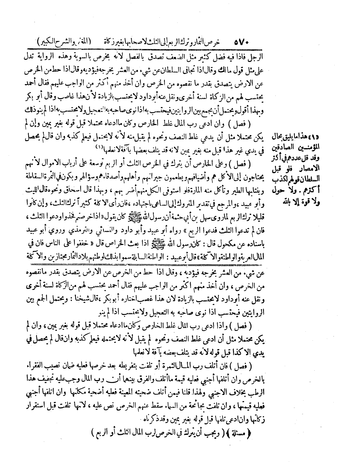 عن شئ من العشر يخرجه فيؤديه، وقال إذا حط من الخرص عن الأرض يتصدق بقدر ما نقصوه من الخرص، وإن أخذ منهم أكثر من الواجب عليهم فقال أحمد يحتسب لهم من الزكاة لسنة أخرى ونقل عنه أبو داود لا يحتسب بالزيادة لان هذا غصب اختاره أبو بكر، قال شيخنا: ويحتمل الجمع بين الروايتين فيحتسب اذا نوى صاحبه به التعجيل ولا يحتسب إذا لم ينو (فصل) وإذا ادعى رب المال غلط الخارص وكان ما ادعاه محتملا قبل قوله بغير يمين، وإن لم يكن محتملا مثل أن ادعى غلط النصف ونحوه لم يقبل لأنه لا يحتمله فيعلم كذبه وإن قال لم يحصل في يدي الا كذ قبل قوله لأنه قد يتلف بعضه بآفة لا نعلمها (فصل) فان أتلف رب المال الثمرة أو تلفت بتفريطه بعد خرصها فعليه ضمان نصيب الفقراء بالخرص وإن أتلفها أجنبي فعليه قيمة ما أتلف والفرق بينهما أن رب المال وجب عليه تجفيف هذا الرطب بخلاف الاجنبي ولهذا قلنا فيمن أتلف ضحيته المعينة فعليه أضحية مكانها وإن أتلفها أجنبي فعليه قيمتها، وان تلفت بحائحة من السماء سقط عنهم الخرص نص عليه، لأنها تلفت قبل استقرار زكاتها وان ادعى تلفها قبل قوله بغير يمين وقد ذكرناه * (مسألة) * (ويجب أن يترك في الخرص لرب المال الثلث أو الربع)