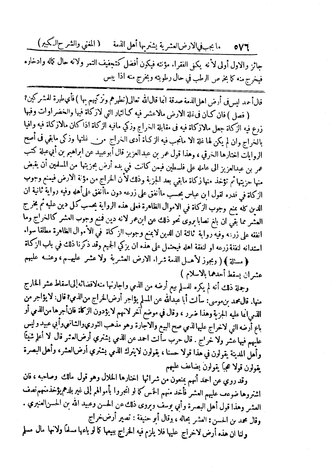 قال أحمد ليس في أرض أهل الذمة صدقة إنما قال الله تعالى (تطهرهم وتزكيهم بها) فأي طهرة للمشركين؟ (فصل) فإن كان في غلة الأرض ما لا عشر فيه كالثمار التي لا زكاة فيها والخضراوات وفيها زرع فيه الزكاة جعل ما لا زكاة فيه في مقابلة الخراج وزكي ما فيه الزكاة إذا كان ما لا زكاة فيه وافيا بالخراج وإن لم يكن لها غلة الا ما تجب فيه الزكاة أدى الخراج من غلتها وزكى ما بقي في أصح الروايات اختارها الخرقي، وهذا قول عمر بن عبد العزيز قال أبو عبيد عن إبراهيم بن أبي عبلة كتب عمر بن عبد العزيز إلى عامله على فلسطين فيمن كانت في يده أرض بجزيتها من المسلمين أن يقبض منها حزيتها ثم تؤخذ منها زكاة ما بقي بعد الجزية وذلك لأن الخراج من مؤنة الارض فيمنع وجوب الزكاة في قدره لقول ابن عباس يحسب ما أنفق على زرعه دون ما أنفق على أهله وفيه رواية ثانية أن الدين كله يمنع وجوب الزكاة في الأموال الظاهرة فعلى هذه الرواية يحسب كل دين عليه ثم يخرج العشر مما بقي ان بلغ نصابا يروى نحو ذلك عن ابن عمر لانه دين فمنع وجوب العشر كالخراج وما
