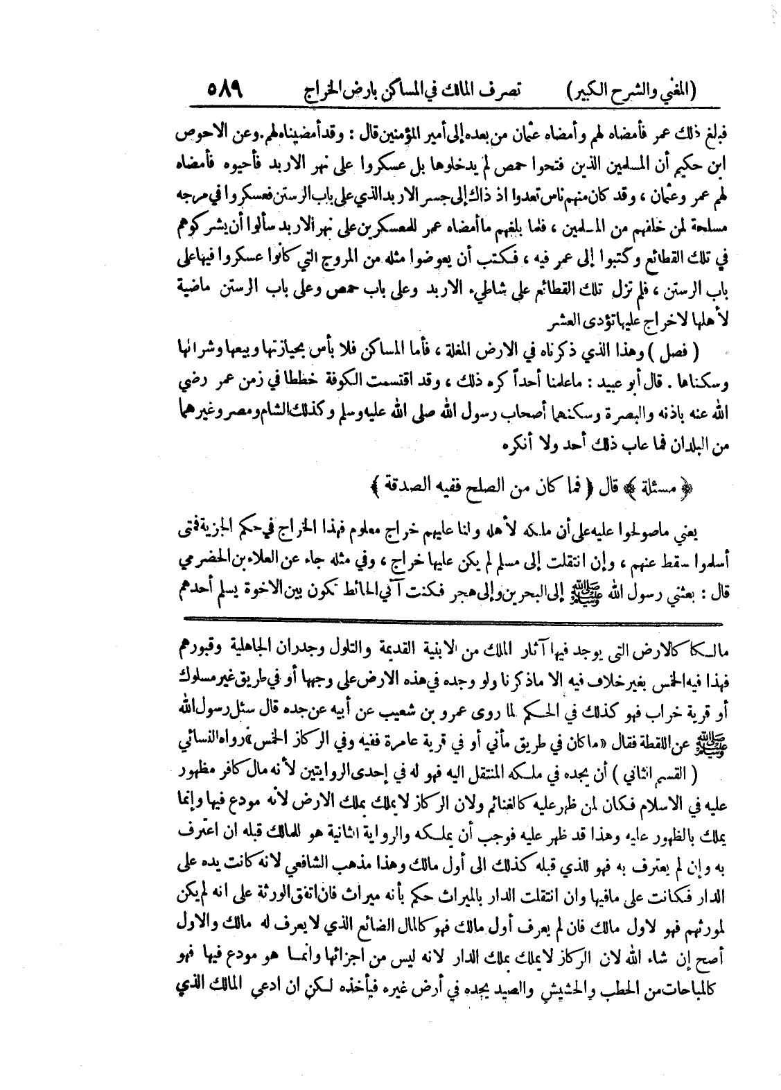 مالكا كالارض التي يوجد فيها آثار الملك من الابنية القديمة والتلول وجدران الجاهلية وقبورهم فهذا فيه الخمس بغير خلاف فيه الا ما ذكرنا ولو وجده في هذه الأرض على وجهها أو في طريق غير مسلوك أو قرية خراب فهو كذلك في الحكم لما روى عمرو بن شعيب عن أبيه عن جده قال سئل رسول الله صلى الله عليه وسلم عن اللقطة فقال " ما كان في طريق مأني أو في قرية عامرة ففيه وفي الركاز الخمس " رواه النسائي (القسم الثاني) أن يجده في ملكه المنتقل اليه فهو له في إحدى الروايتين لأنه مال كافر مظهور